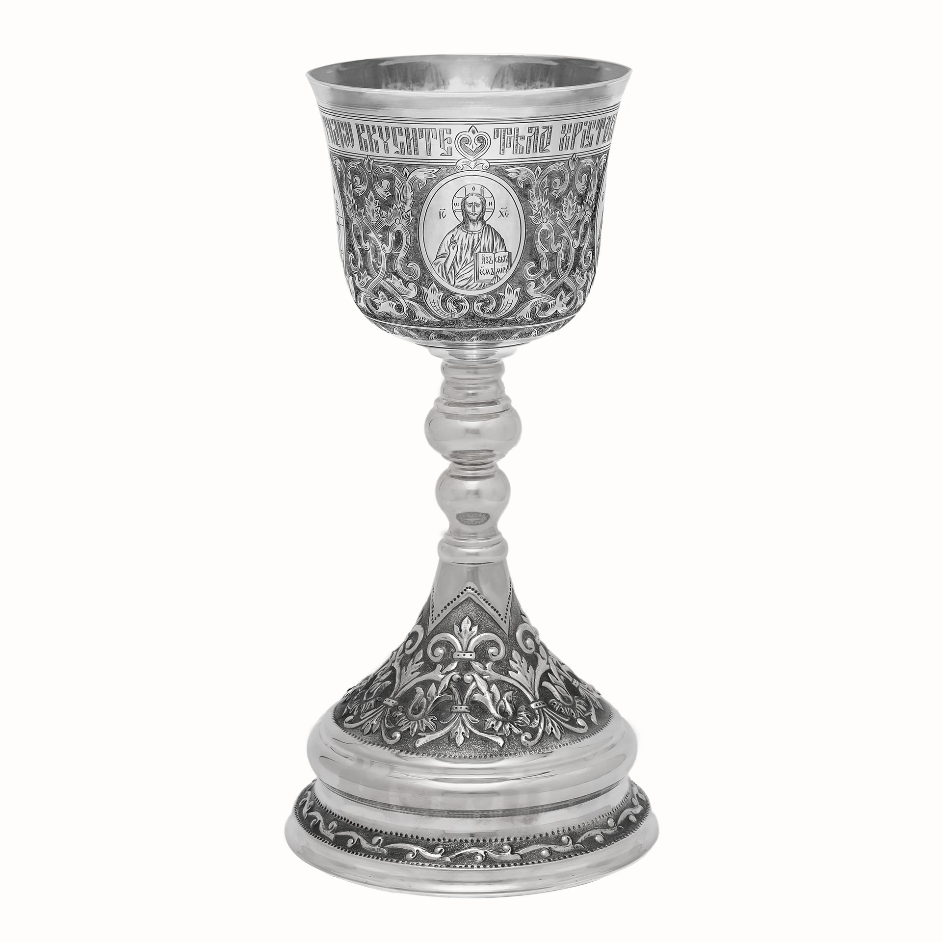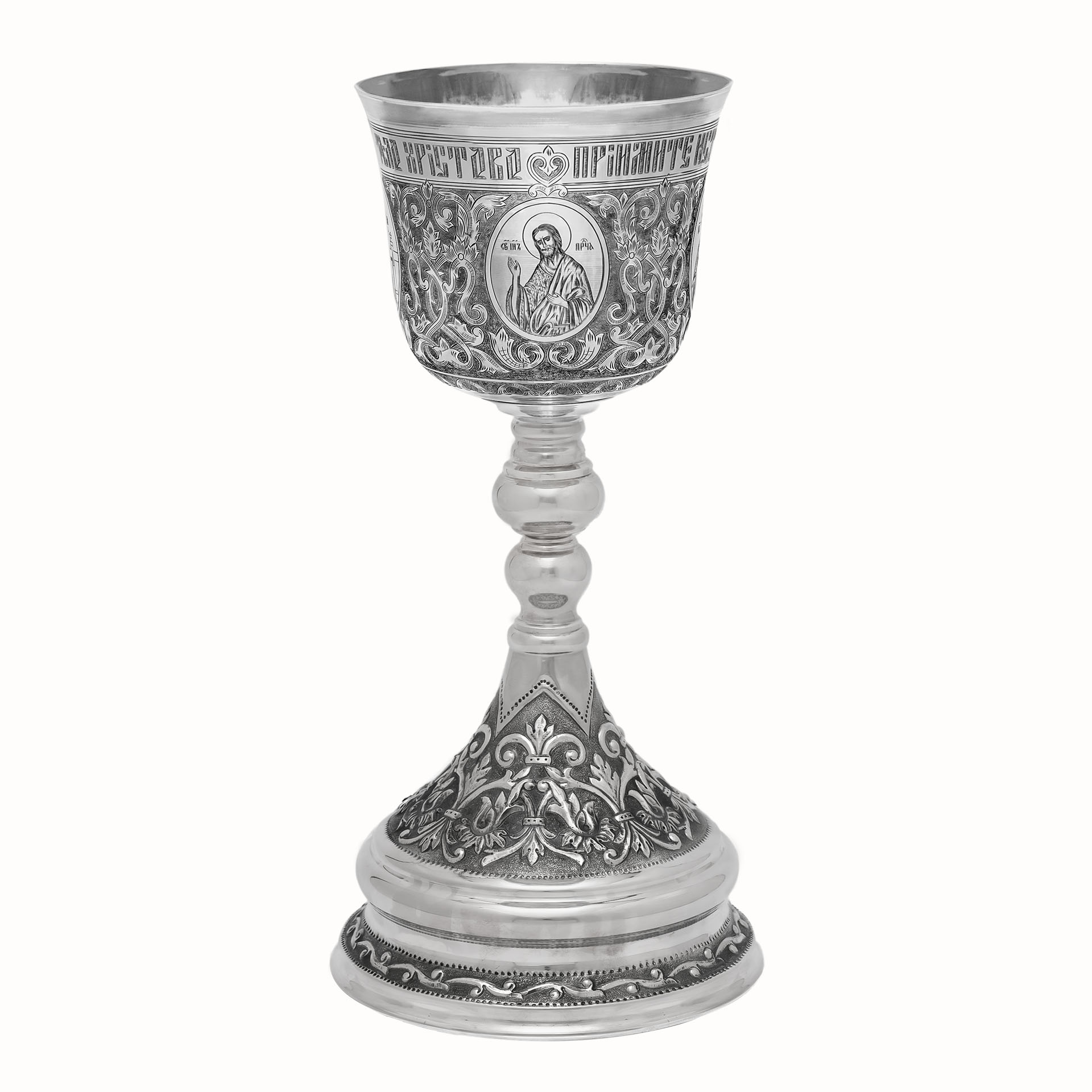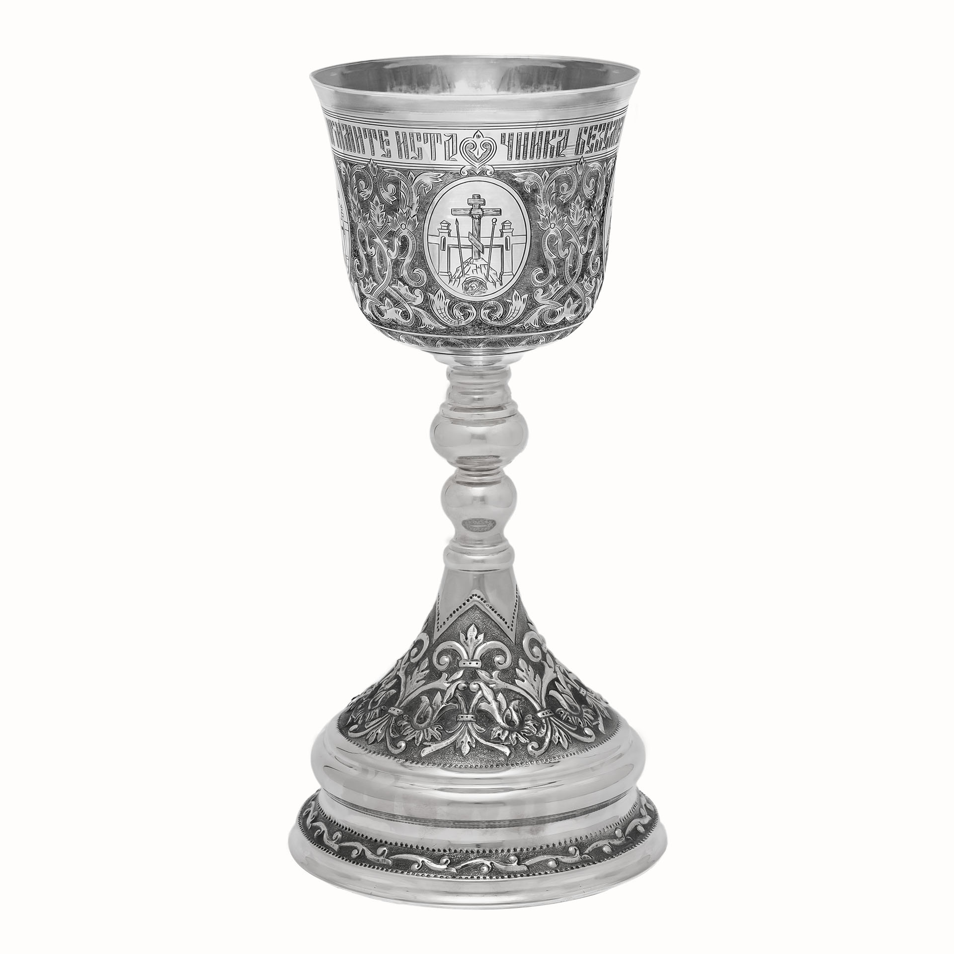 Потир 1.0л ручная гравировка с 4мя-ликами, чеканка / поддон 1,5л потира / серебро (УИН)