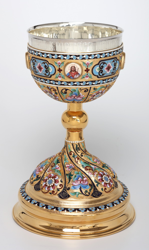 Потир 1.5л 4-финифти, филигрань, эмаль, роспись, чеканка "№11" / золочение / серебряный стакан (УИН)