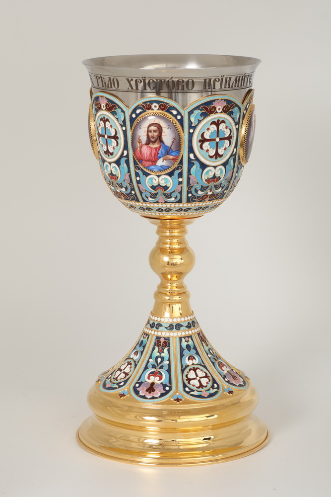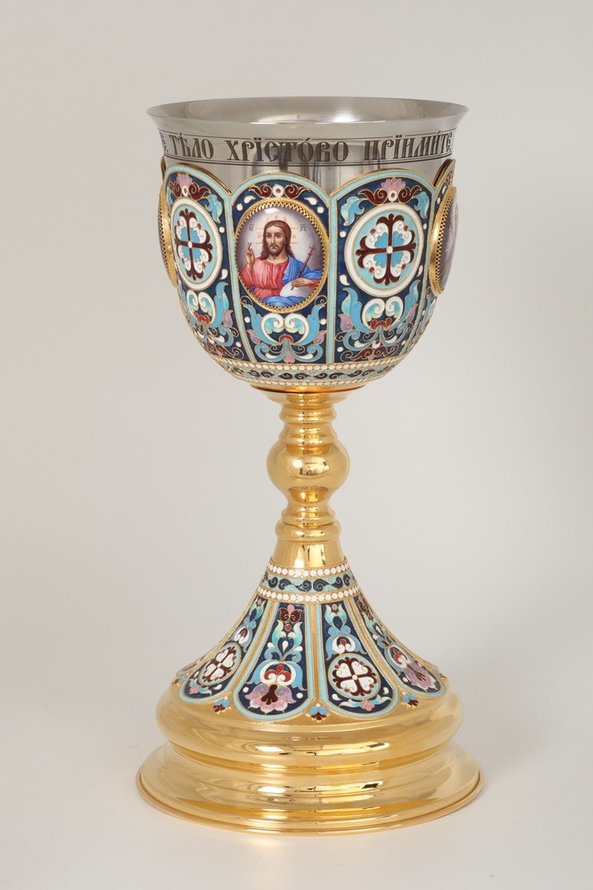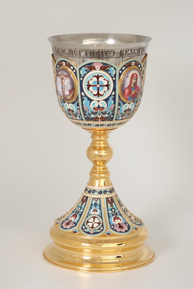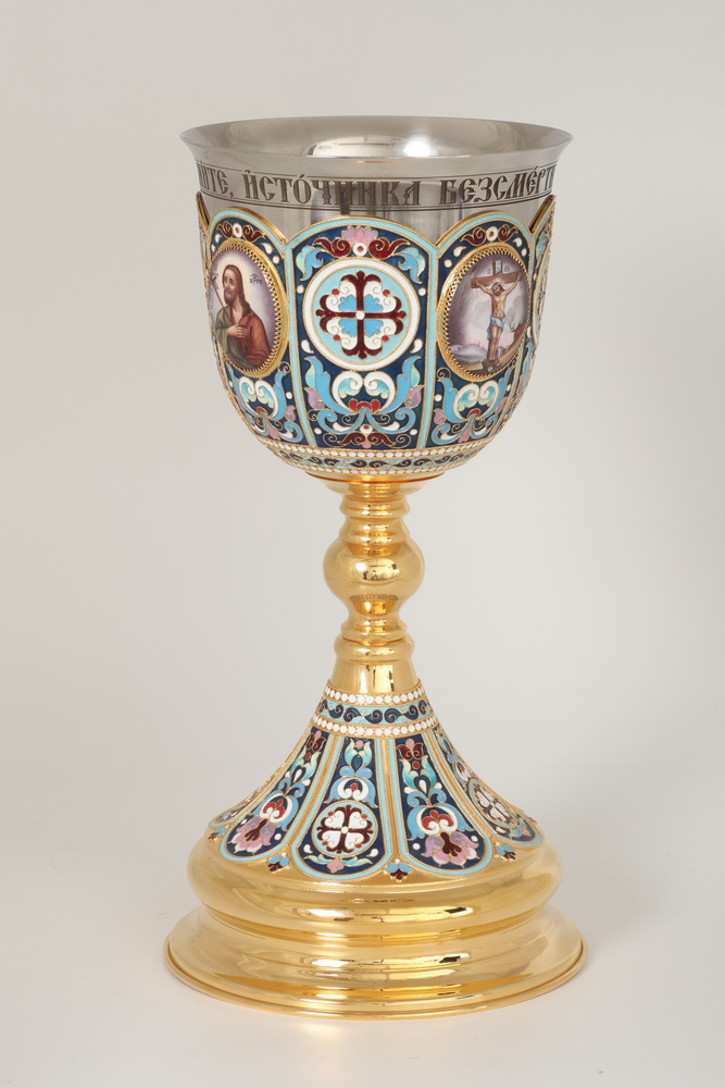 Потир, выполненный из латуни и меди, имеет объем 1,5 л. Основание потира украшено эмалевыми узорами, филигранными орнаментами и четырьмя иконами-медальонами с изображениями Христа, Божией Матери, Иоанна Предтечи и Распятия, выполненными методом финифти. Внутренняя часть чаши, изготовленная из нержавеющей стали, представляет собой стакан, на кайме которого написаны слова молитвы: «Тело Христово приимите, Источника Безсмертного вкусите».