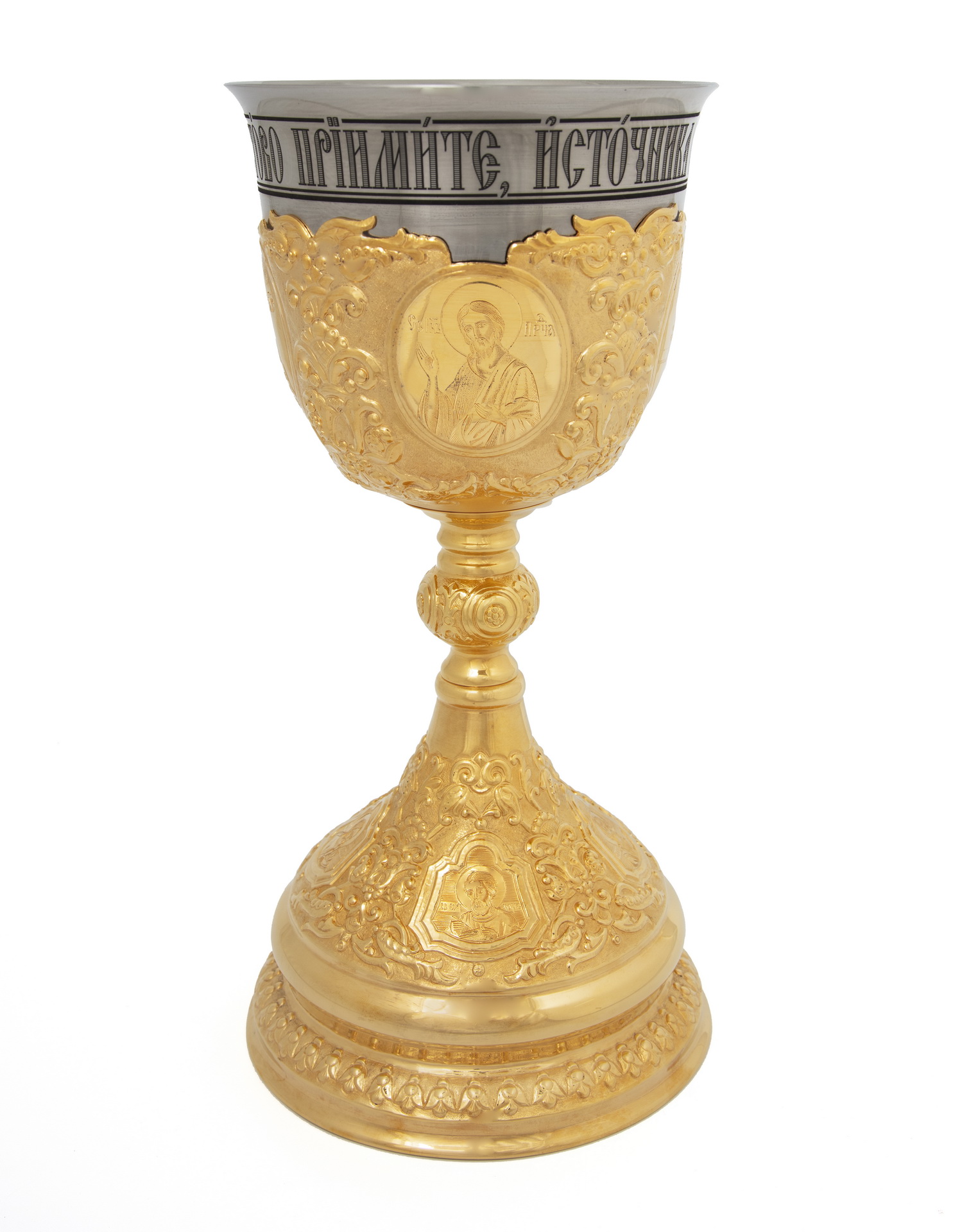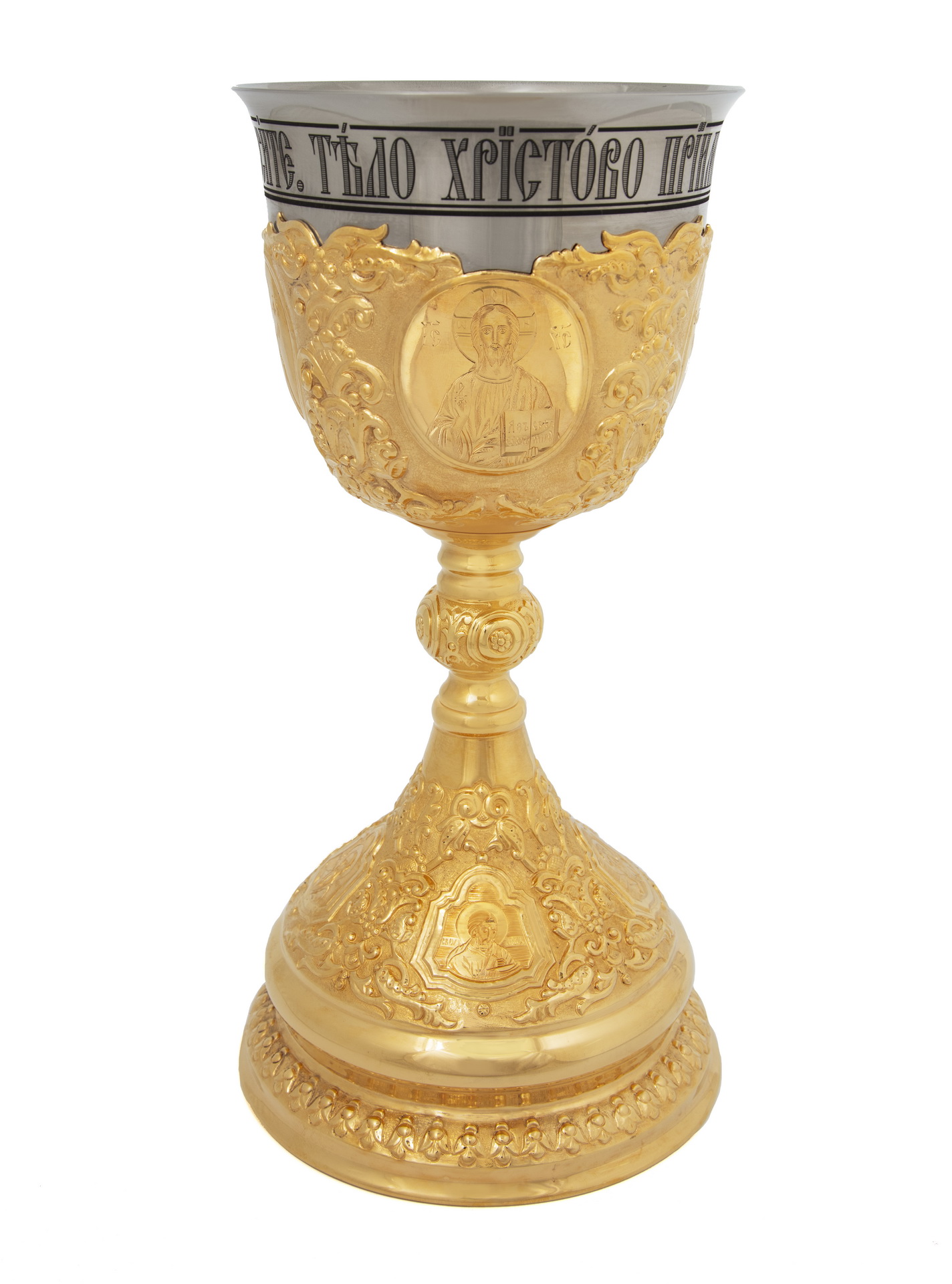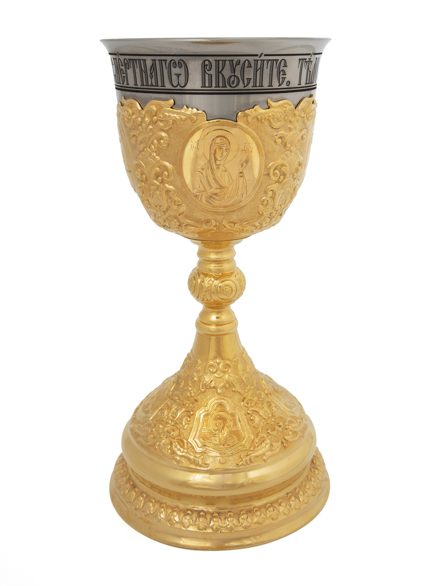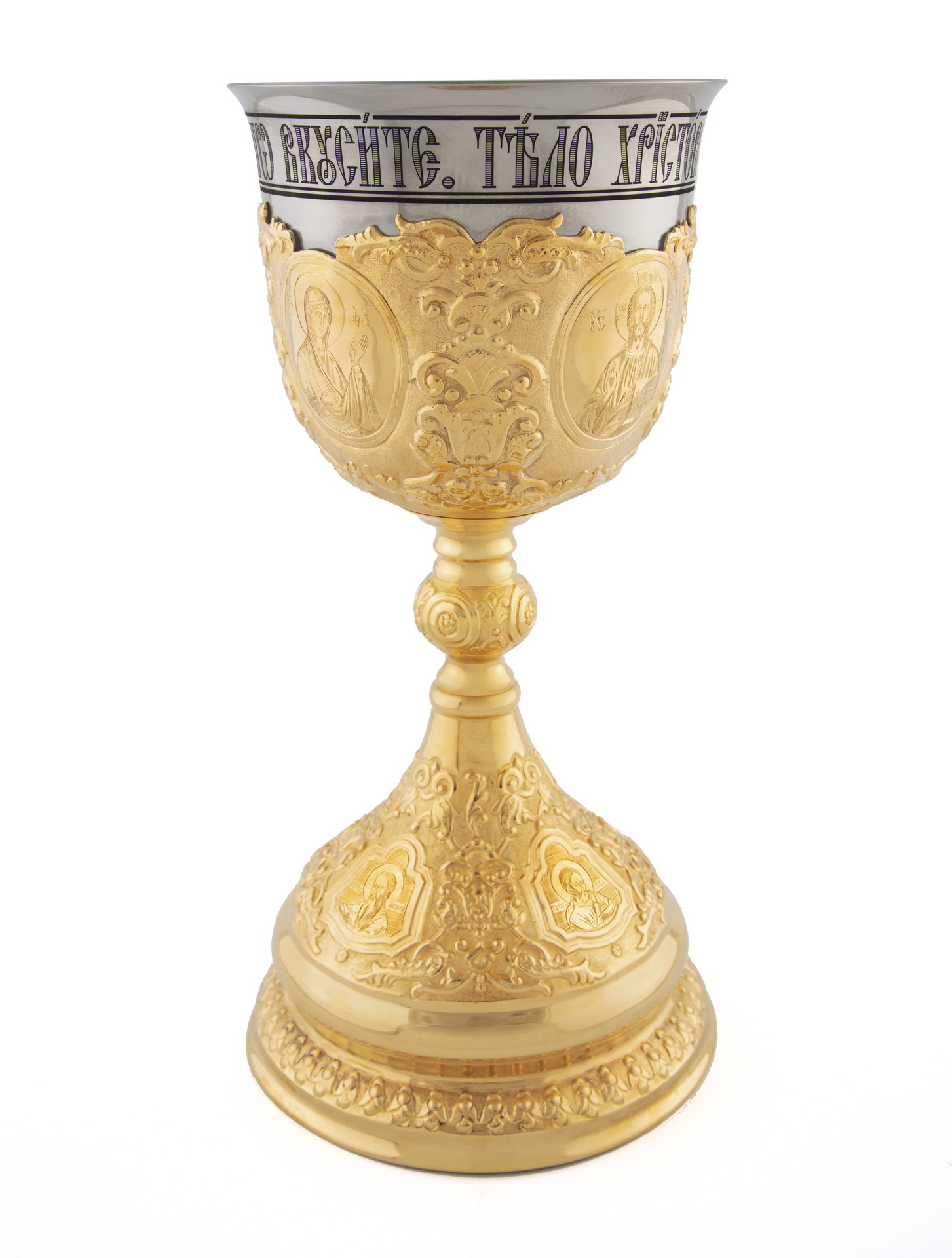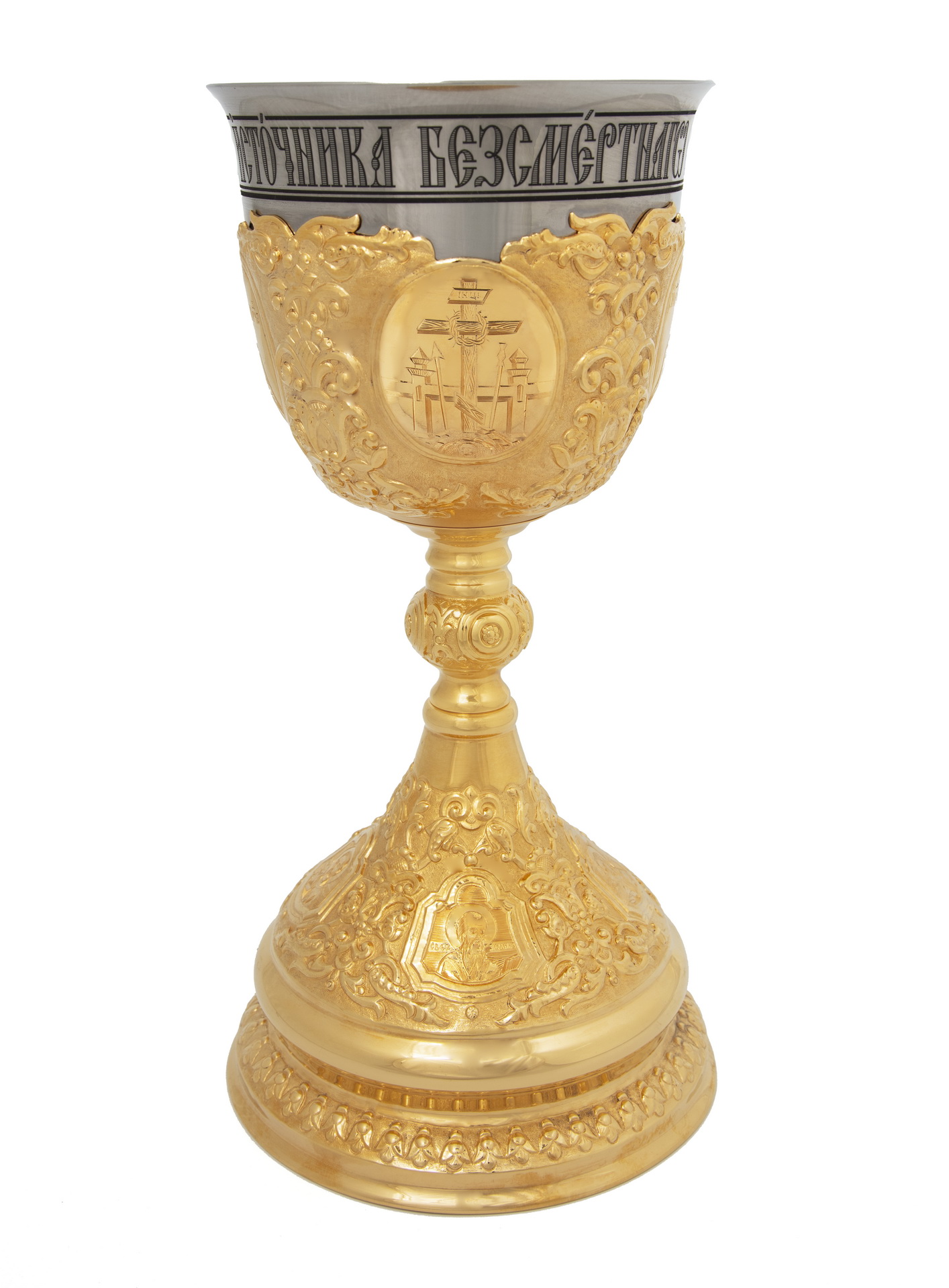Потир 1.5л 8-гравированных ликов, чеканка / золочение / нержавеющий стакан
