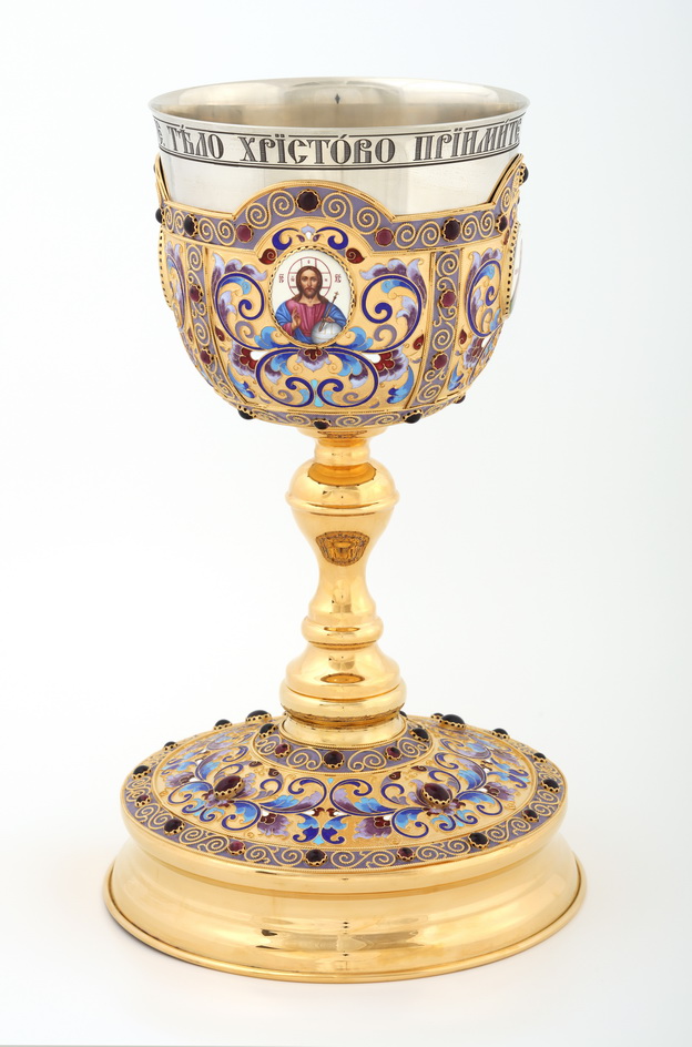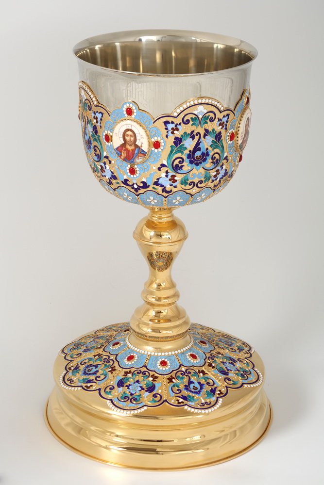 Богато украшенный потир, сочетающий в себе различные материалы и техники, станет настоящим украшением богослужения. Выполненный из мельхиора и меди, потир покрыт позолотой. Чаша украшена филигранью, эмалью, камнями и четырьмя медальонами с изображениями Христа, Божией Матери, Иоанна Предтечи и Креста Господня, выполненными методом финифти. На кайме чаши написаны слова молитвы: «Тело Христово приимите, Источника Безсмертного вкусите». Объем потира составляет 3 л.