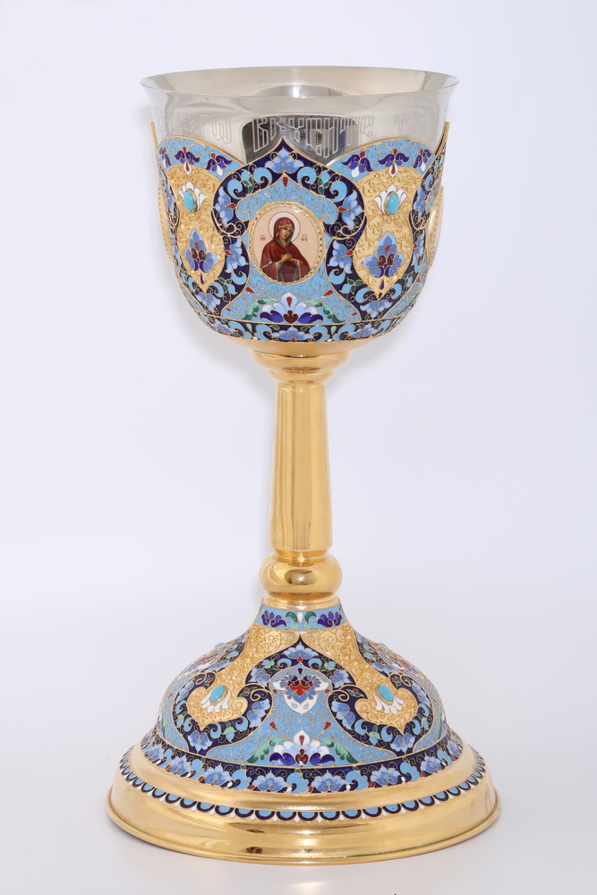 Изящный медно-латуневый потир, обвитый эмалевыми цветами, станет настоящим украшением богослужения, особенно в дни поминовения Пресвятой Богородицы, когда все духовенство будет облачено в голубые одежды. По краю чаши методом лазерной гравировки написаны слова молитвы, которая поется во время причащения мирян: «Тело Христово приимите, Источника Безсмертного вкусите». Также чаша украшена четырьмя иконами-медальонами с изображениями Христа, Божией Матери, Иоанна Предтечи и Распятия, выполненными методом финифти. Во избежание появления темных пятен на изделиях из мельхиора требуется его надлежащая эксплуатация и уход. Чтобы избежать потемнения изделий из мельхиора, следует сразу после мытья насухо протирать метал мягкой тканью. Каждая капля воды, высохшая на поверхности из мельхиора естественным путем, оставит после себя темную окись.