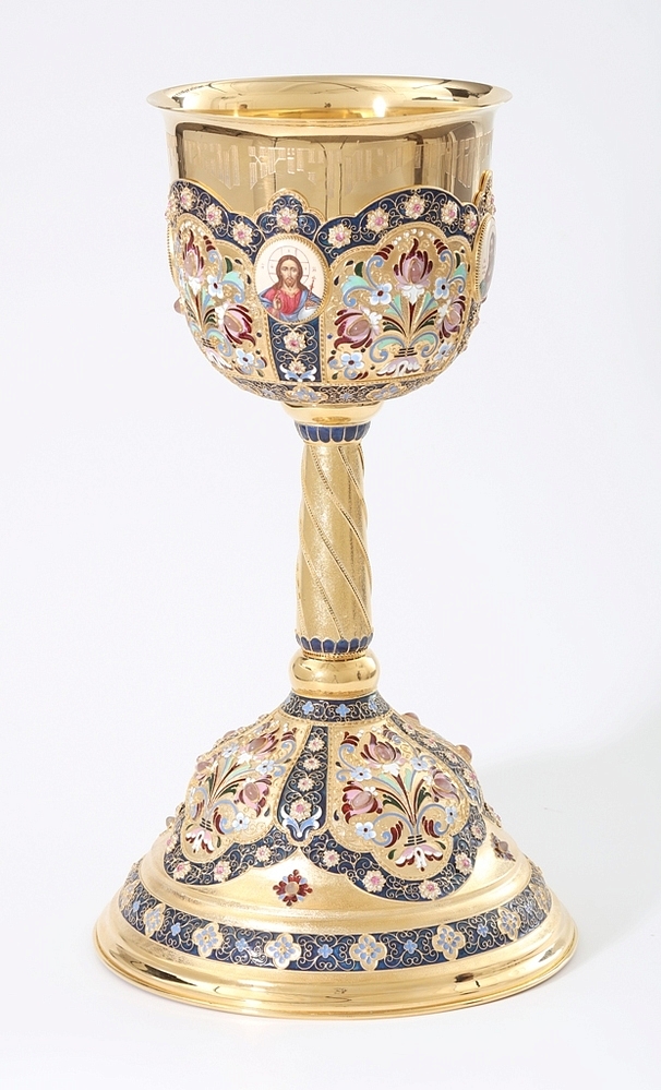 Изящный и гармоничный, потир выполнен из мельхиора и меди. Потир украшен эмалевыми узорами, филигранными орнаментами, объемными розовыми камнями и четырьмя иконами-медальонами с изображениями Христа, Божией Матери, Иоанна Предтечи и Распятия, выполненными методом финифти. На кайме чаши написаны слова молитвы: «Тело Христово приимите, Источника Безсмертного вкусите».