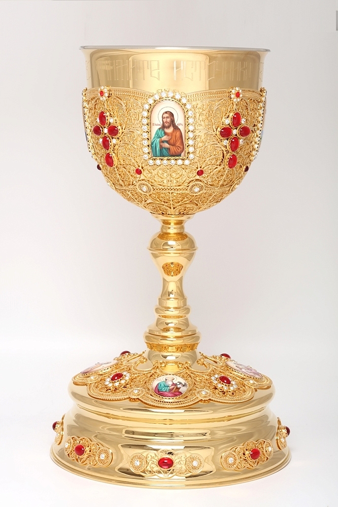 Царственный и минималистичный, потир имеет объем 5 л. На золотом фоне, представляющем собой тонкое филигранное кружево, ярко выделяются четыре финифти с изображениями Христа, Божией Матери, Иоанна Предтечи и Распятия, а также объемные кресты камней. Размеры потира составляют 510х305х510 мм. Во избежание появления темных пятен на изделиях из мельхиора требуется его надлежащая эксплуатация и уход. Чтобы избежать потемнения изделий из мельхиора, следует сразу после мытья насухо протирать метал мягкой тканью. Каждая капля воды, высохшая на поверхности из мельхиора естественным путем, оставит после себя темную окись.
