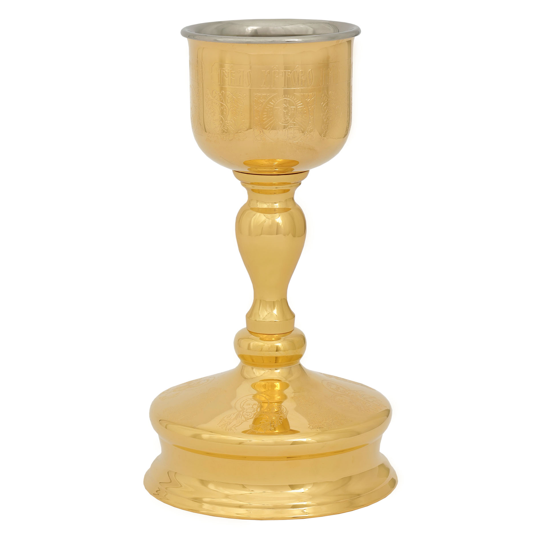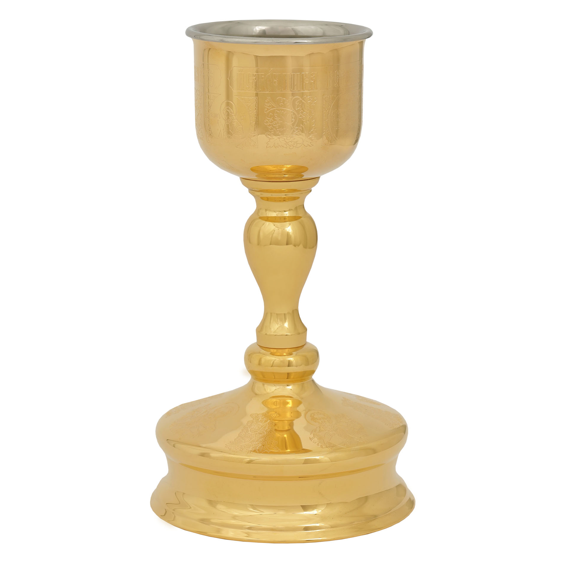 Классический потир, выполненный из латуни, имеет объем 0,25 л. Вкладыш из мельхиора защищает Святые Дары от внешних воздействий. Серебрено-позолоченная поверхность потира украшена тонкой резьбой, выполненной методом химической гравировки. Изделие упаковано в картонную коробку размером 240х150х135 мм. Во избежание появления темных пятен на изделиях из мельхиора требуется его надлежащая эксплуатация и уход. Чтобы избежать потемнения изделий из мельхиора, следует сразу после мытья насухо протирать метал мягкой тканью. Каждая капля воды, высохшая на поверхности из мельхиора естественным путем, оставит после себя темную окись.