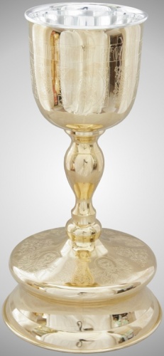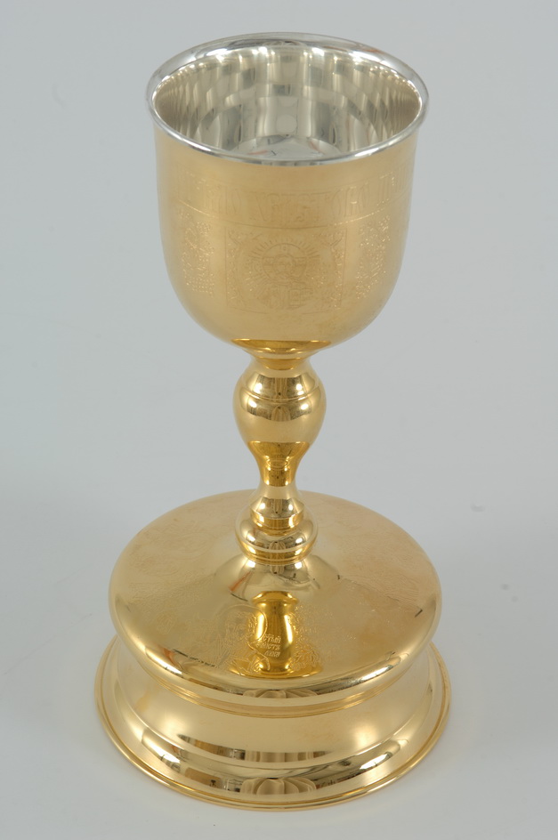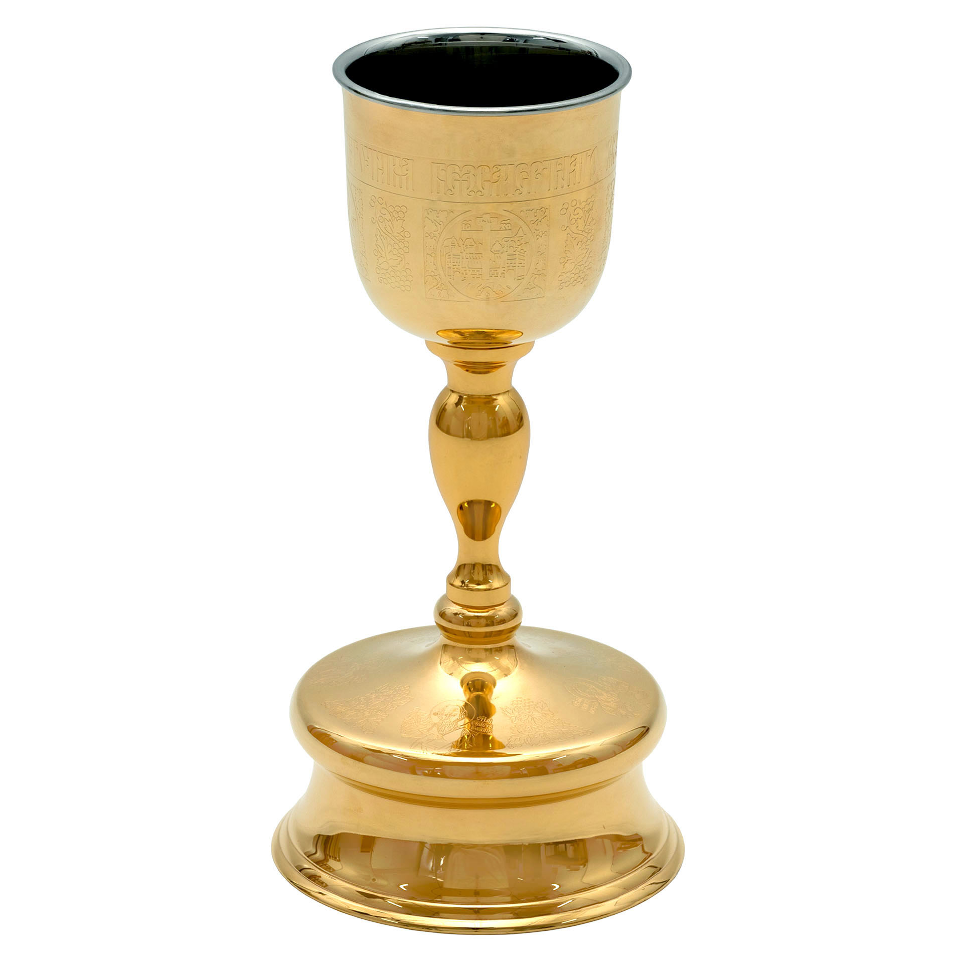 Классический потир, выполненный из латуни и нержавеющей стали, впишется в любой евхаристический набор. Ручка потира, украшенная рельефной резьбой, не будет выскальзывать из рук священнослужителя, а массивная устойчивая подставка не позволит сосуду упасть. Позолоченная поверхность потира украшена тонкой резьбой с изображением Господа Вседержителя и четырех евангелистов. По краю чаши написаны слова молитвы, которая поется во время причащения мирян: «Тело Христово приимите, Источника Безсмертного вкусите».