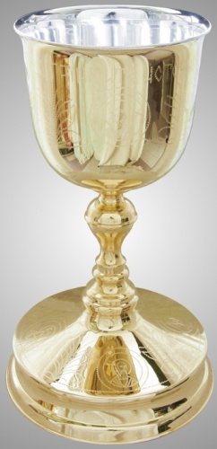 Потир, выполненный из латуни и мельхиора, имеет объем 3 л. Методом ручной гравировки на серебряно-позолоченную поверхность потира нанесены растительные узоры и священные изображения. На широкой устойчивой ножке изображены четыре медальона с евангелистами, а на самой чаше – слова молитвы: «Тело Христово приимите, Источника Безсмертного вкусите». Во избежание появления темных пятен на изделиях из мельхиора требуется его надлежащая эксплуатация и уход. Чтобы избежать потемнения изделий из мельхиора, следует сразу после мытья насухо протирать метал мягкой тканью. Каждая капля воды, высохшая на поверхности из мельхиора естественным путем, оставит после себя темную окись.