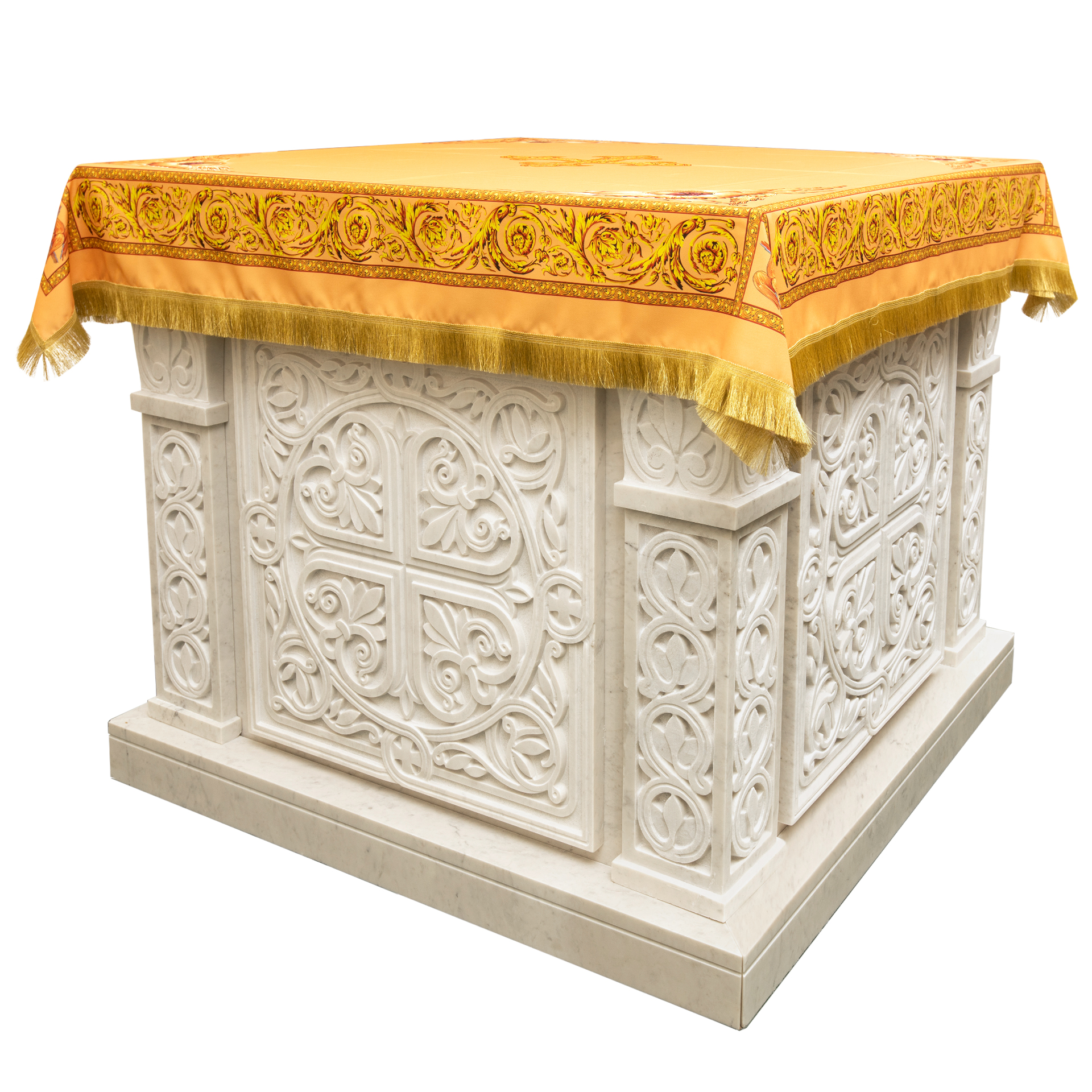 Престол в византийском стиле из белого мрамора украсит алтарь большого храма и придаст ощущение сакральности и торжественности обстановки.