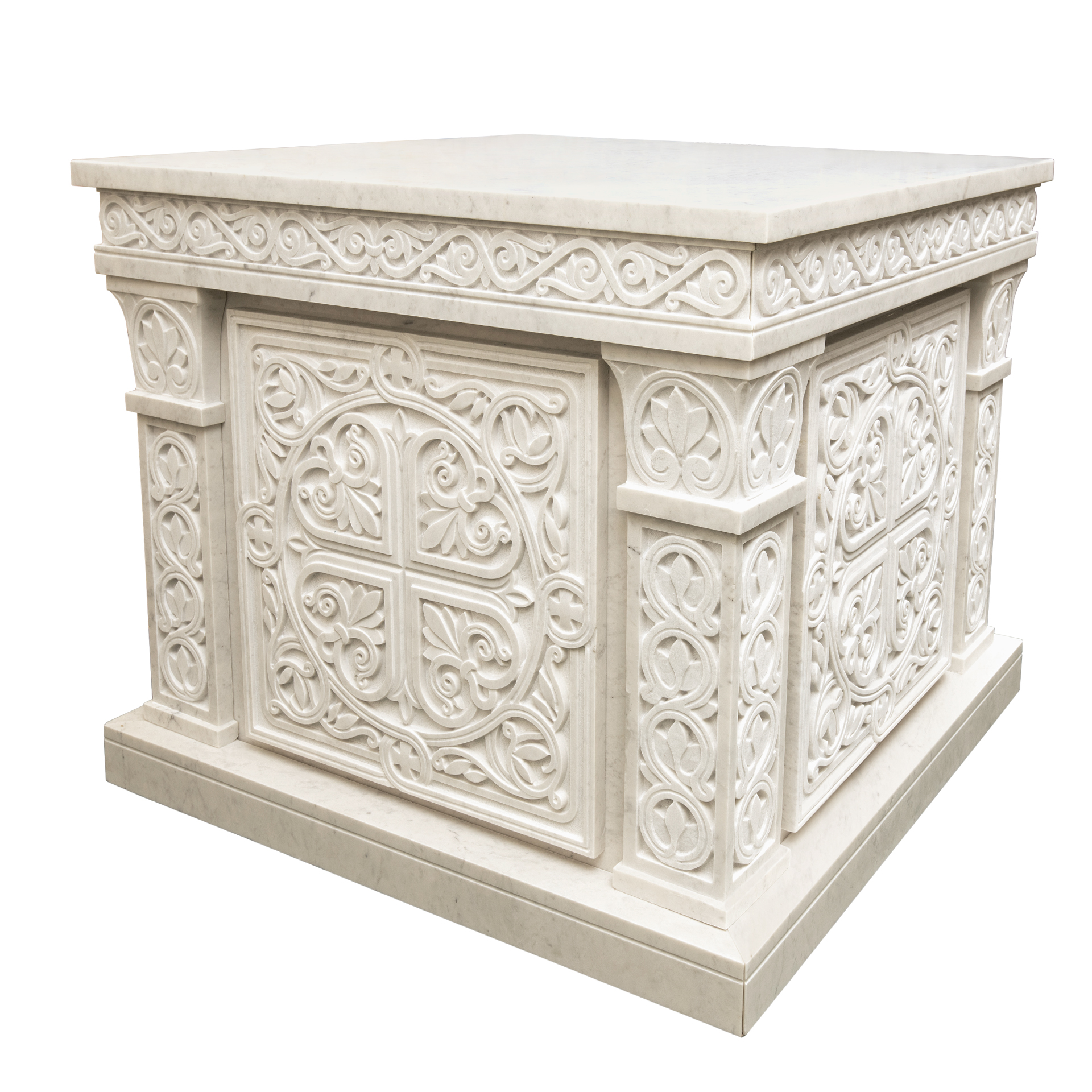 Престол в византийском стиле из белого мрамора украсит алтарь большого храма и придаст ощущение сакральности и торжественности обстановки.