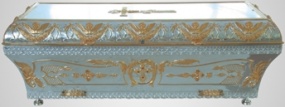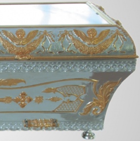 Ра́ка – украшенная гробница, в которой находятся мощи святого. Обычно рака имеет вид ковчега с иконописным изображением святого на верхней доске. Необычная гальванопластическая рака не только станет достойным местом упокоения святых мощей, но и украсит интерьер храма. На серебряном фоне ярко выделятся золотые элементы геометрических узоров и Крест – символ спасения. Подставка - 1700 х 650 х 500 мм