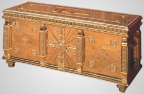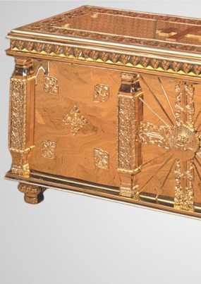 Ра́ка – украшенная гробница, в которой находятся мощи святого. Обычно рака имеет вид ковчега с иконописным изображением святого на верхней доске. Латуневая рака на ножках, имеющая необычный медный оттенок, станет достойным местом упокоения святых мощей. Скромная и лаконичная, данная модель впишется в интерьер практически любого храма. Украшенная минималистичными узорами, рака не будет отвлекать внимание молящихся. Непрозрачная крышка, скрывающая мощи святого, украшена объемным Крестом.