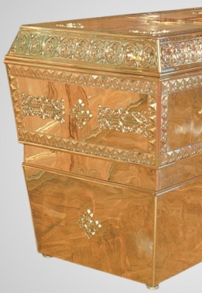 Ра́ка – украшенная гробница, в которой находятся мощи святого. Обычно рака имеет вид ковчега с иконописным изображением святого на верхней доске. Позолоченная рака на ножках станет достойным местом упокоения святых мощей. Благодаря своей скромной изящности, данная модель впишется в интерьер практически любого храма. Украшенная геометрическими узорами, рака не будет отвлекать внимание молящихся. Непрозрачная крышка, скрывающая мощи святого, украшена объемным Крестом. Подставка - 1800 х 600 х 400 мм