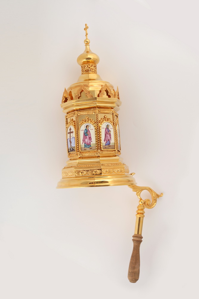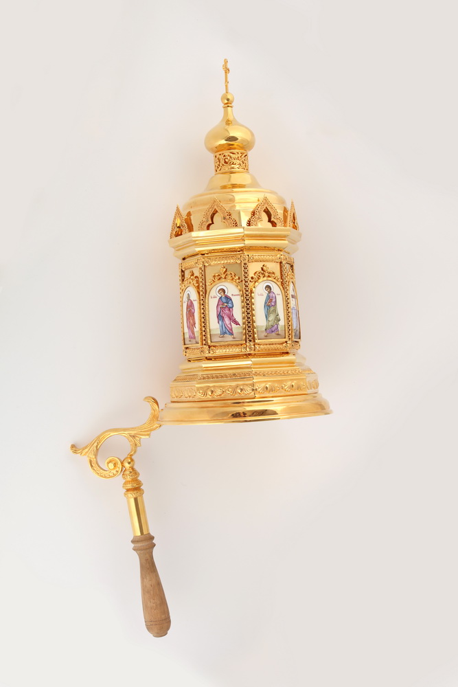 Данная модель позолоченного сиона украшена шестнадцатью иконами, выполненными в технике финифть. У сиона есть ручка с деревянным окончанием, что делает утварь удобной для переноса.