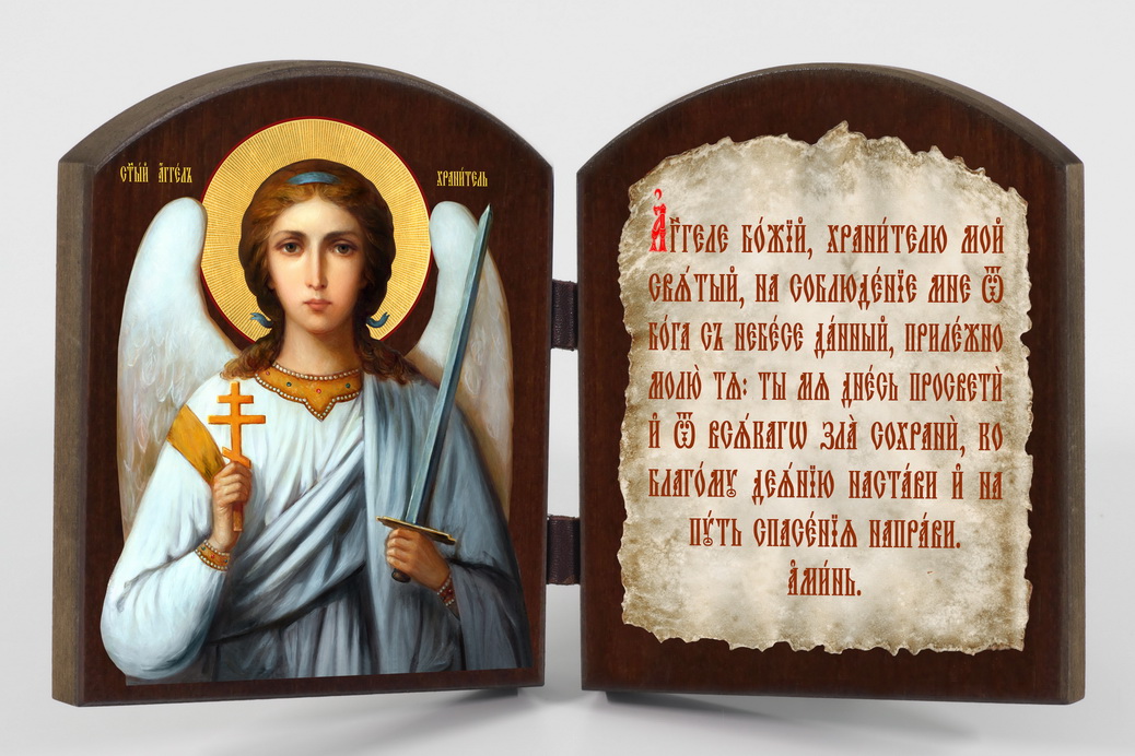 Складень резной арочный, 10х12 объемная печать, лак Ангел Хранитель (с молитвой)