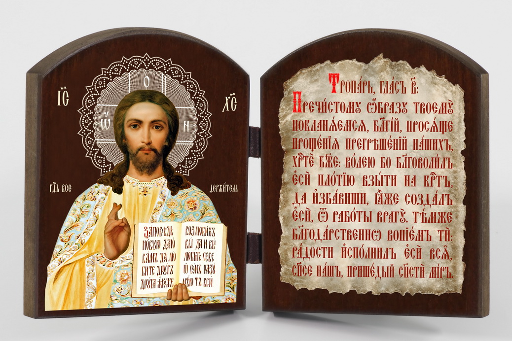Складень резной арочный, 10х12 объемная печать, лак Спаситель (с молитвой)