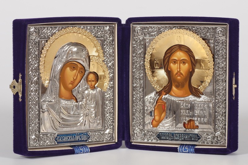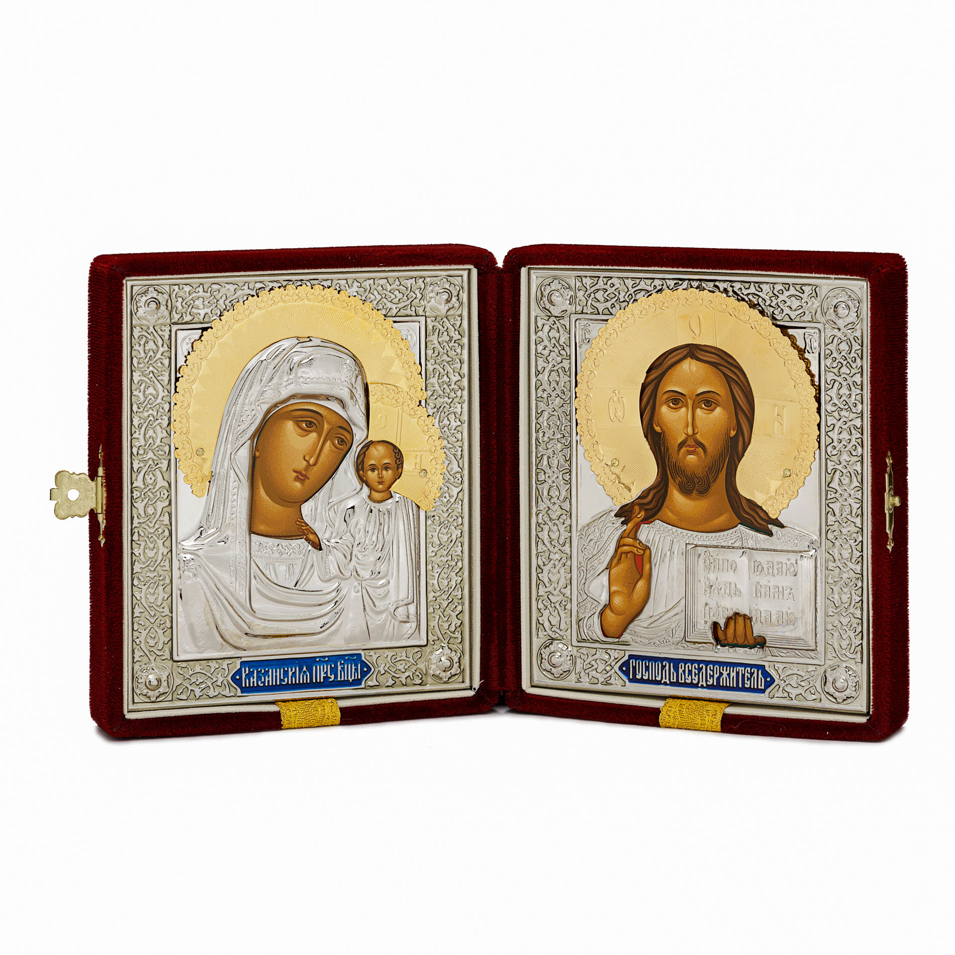 Складень в футляре 11х13 бархат, темпера, риза объемная, никелирование, эмаль Спаситель-Казанская БМ