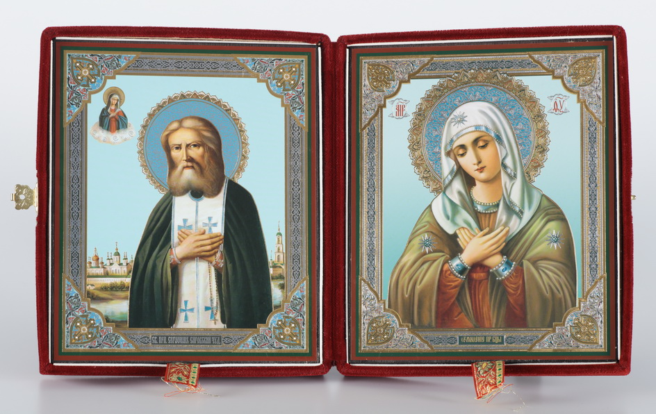 Складень в футляре 18х24 бархат, двойное тиснение, планшет 18мм Серафим Саровский 2 + Умиление 2