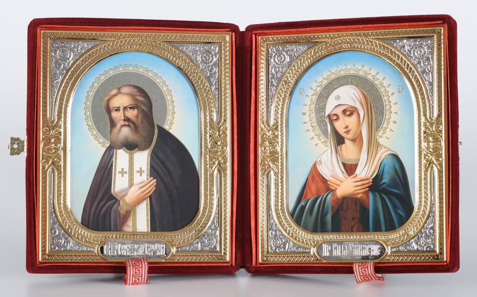 Складень в футляре 18х24 бархат, двойное тиснение, риза-рамка частично золочёная Серафим Саровский - Умиление