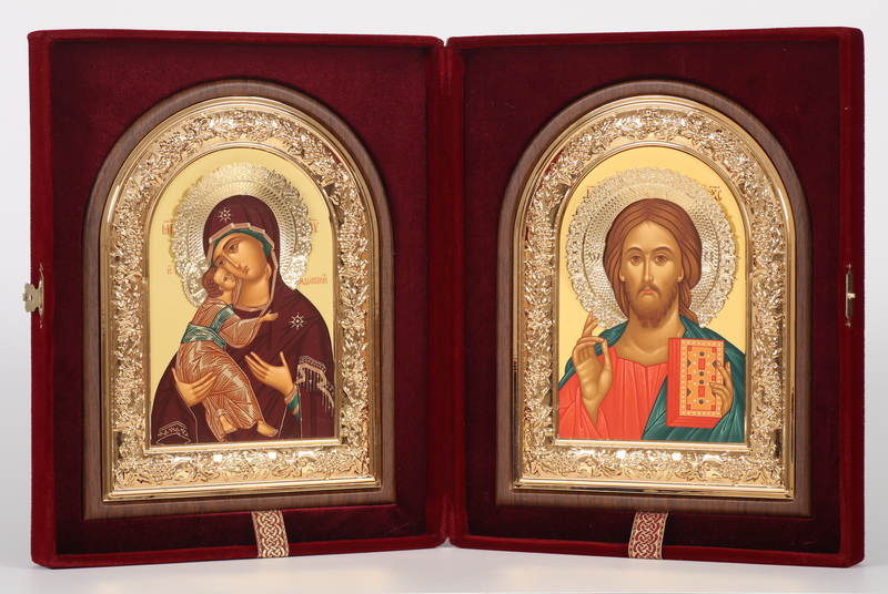 Складень в футляре 18х24 бархат, темпера, арочная, рамка и венчик золочёные Спаситель-Владимирская БМ