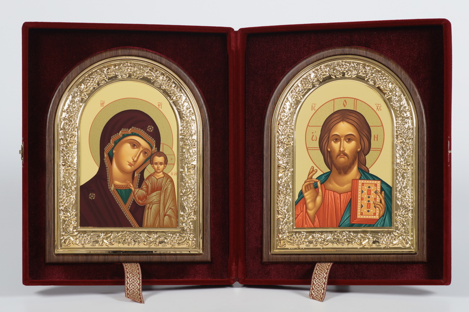 Складень в футляре 18х24 бархат, темпера, арочная, рамка золочёная Спаситель-Казанская БМ