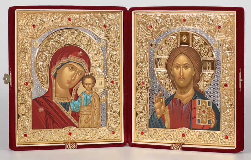 Складень в футляре 18х24 бархат, темпера, объемная риза без цаты, золочение, никелирование