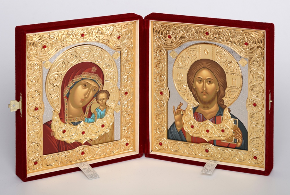 Складень в футляре 18х24 бархат, темпера, объемная риза с цатой, золочение, никелирование