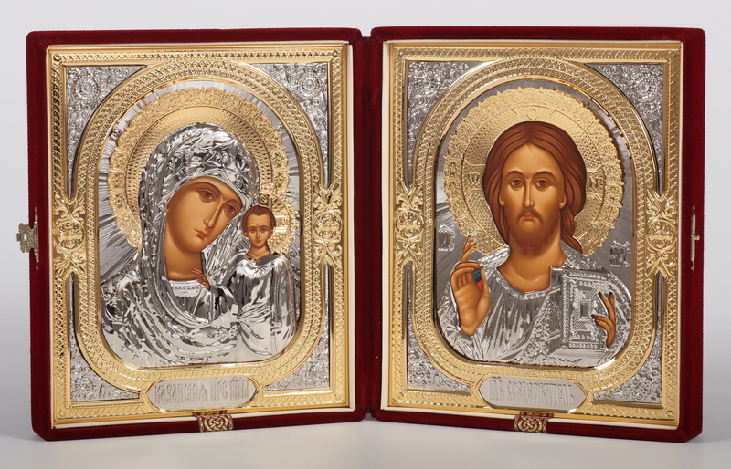 Складень в футляре 18х24 бархат, темпера, объемная риза, золочение, никелирование