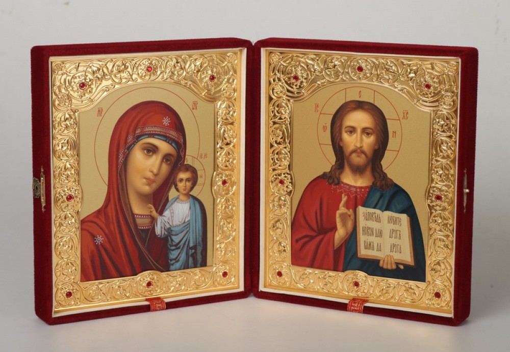 Складень в футляре 18х24 бархат, темпера, рамка фигурная, золочёная Спаситель-Казанская БМ 1