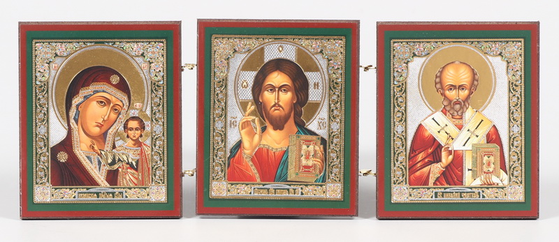 Складни деревянные 7х18 трехстворчатые, двойное тиснение Спаситель-Казанская БМ-Н.Чудотворец 10