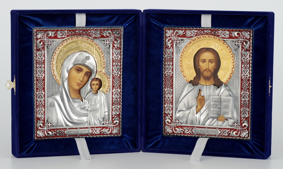 Складни живописные в футляре 18х24 темпера, ризы №241, №242 черненое серебрение, эмаль (бархат)