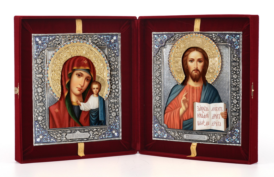Складни живописные в футляре 24х30 масло, ризы №1, №24 открытые, черненое серебрение, эмаль (бархат) Спаситель-Казанская БМ