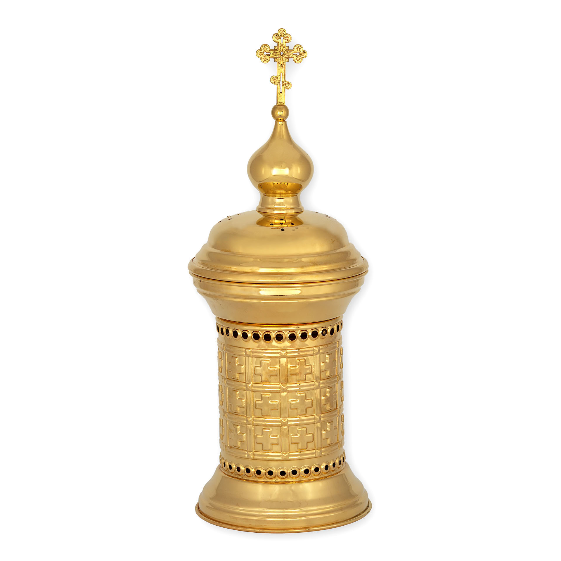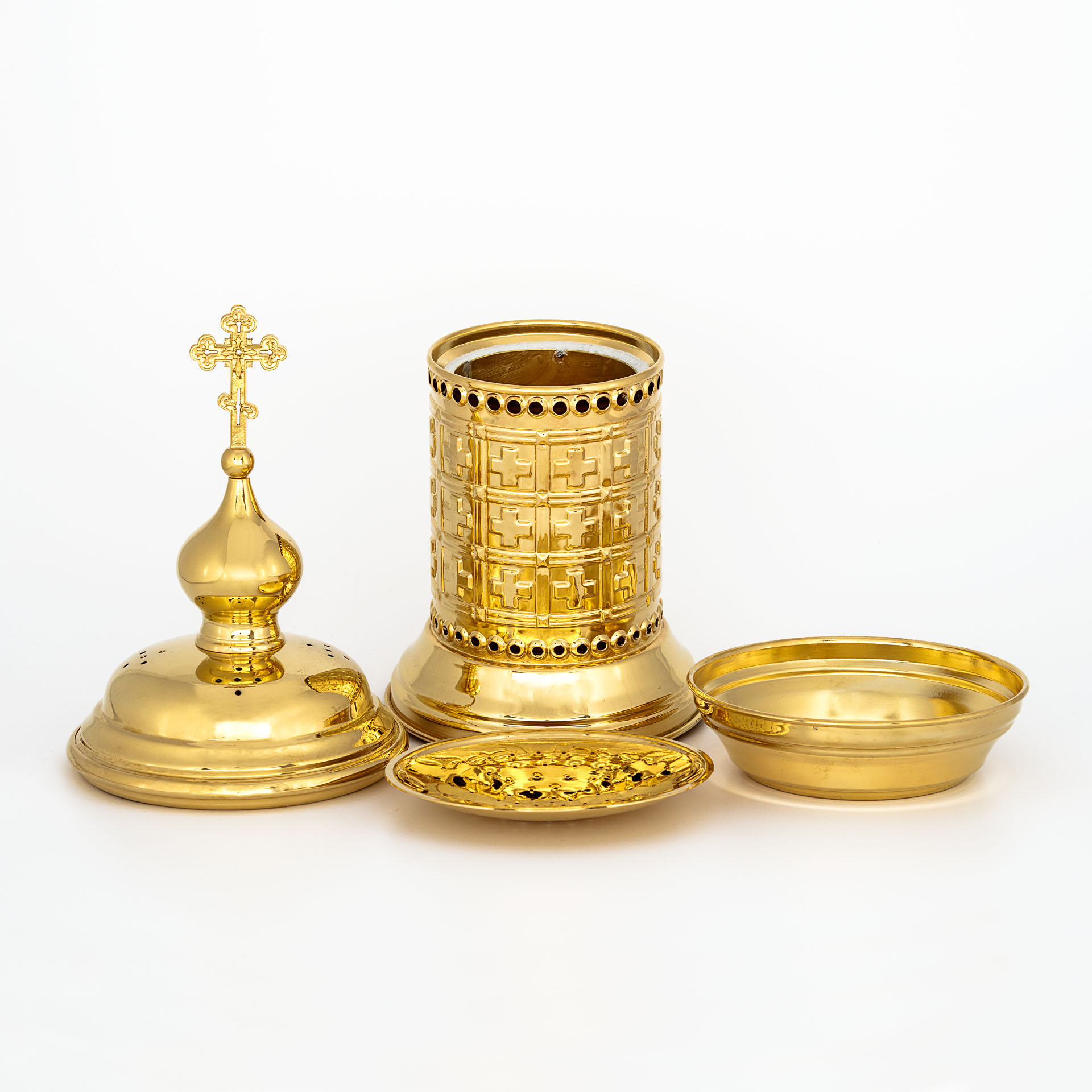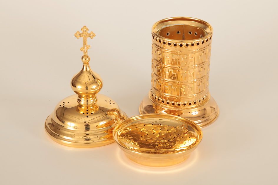 Сосуд для преждеосвященных Даров выполнен в форме круглой золотой часовни, стены и купол которой украшены крестами. В сосуде сделаны многочисленные отверстия для вентиляции, что защитит Святые Дары от появления плесени. Сосуд предназначен для сушки преждеосвященных даров.
