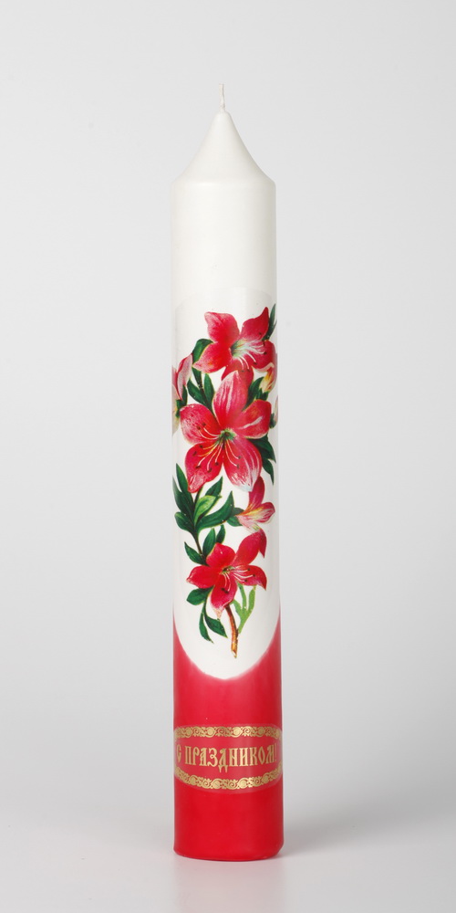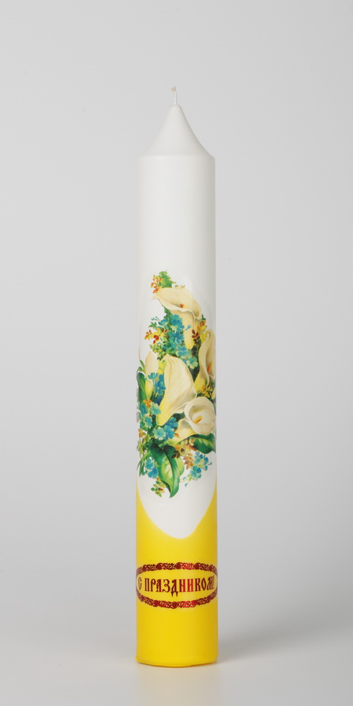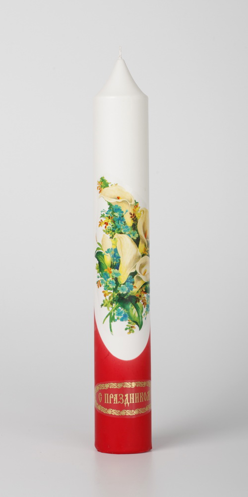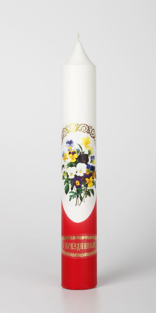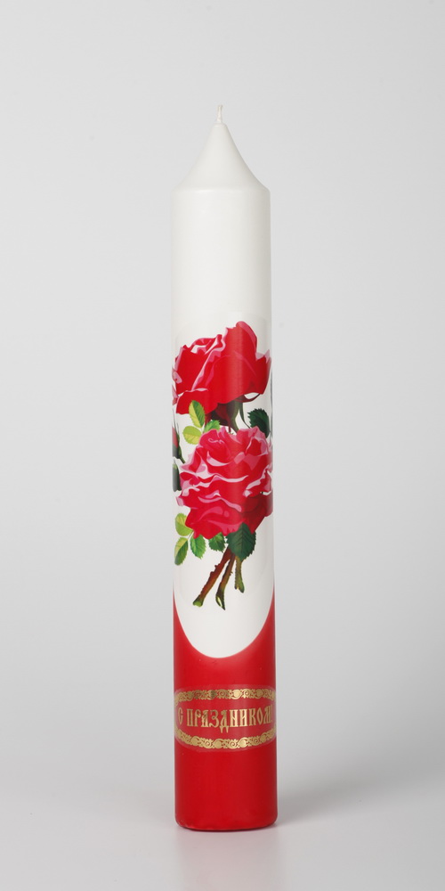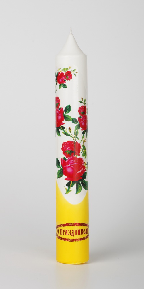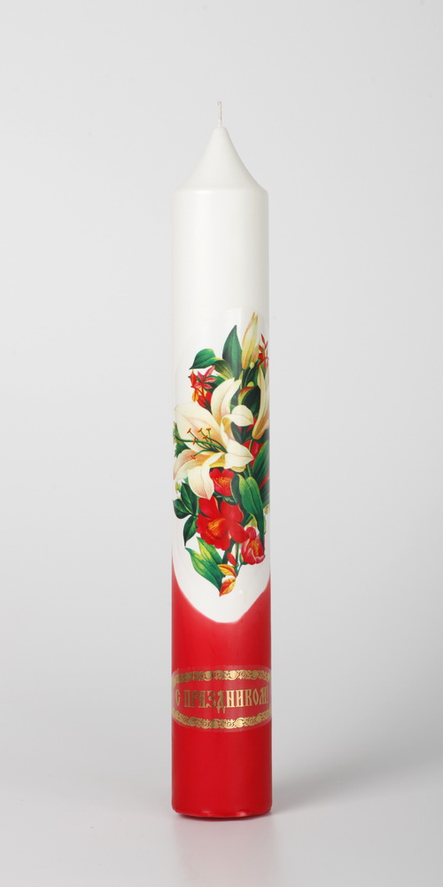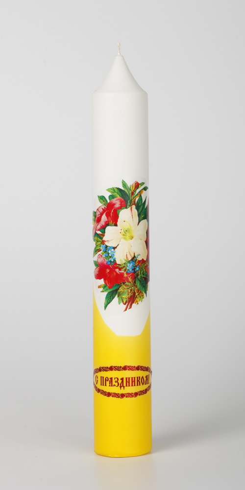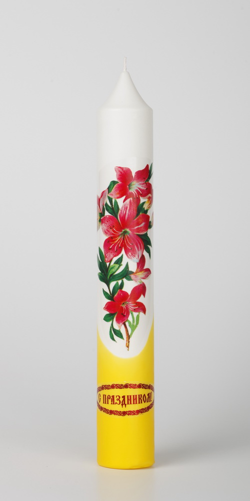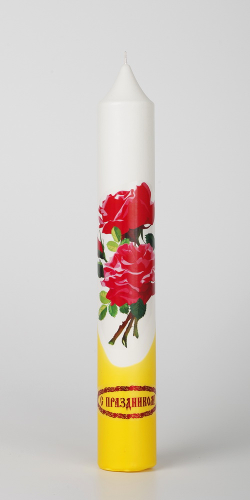 Диаконская свеча выполнена из парафина , её украшает яркая деколь, и поздравительная надпись.