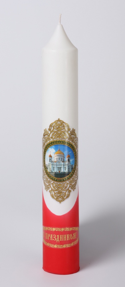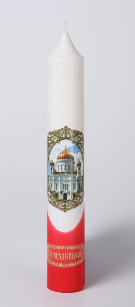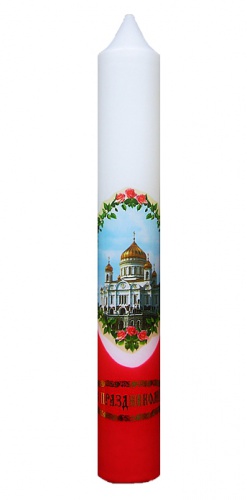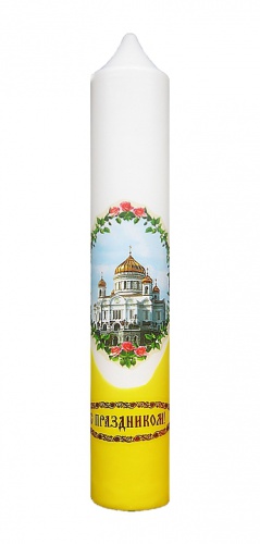 Диаконская свеча выполнена из парафина , её украшает яркая деколь, с изображением Храма Христа Спасителя и поздравительная надпись.