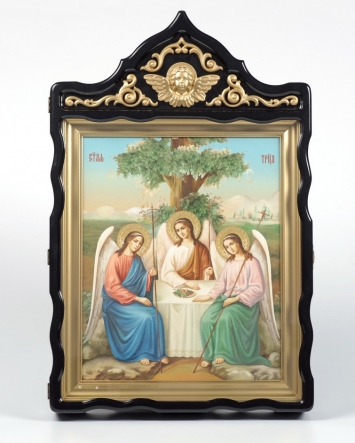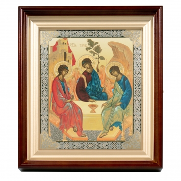 Икона живописная на доске в киоте 24х30 золоченый нимб, киот №6 Троица