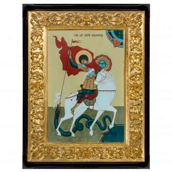 Киот настенный 70х90 с резным золоченым подрамником, с иконой на канвасе Георгий Победоносец