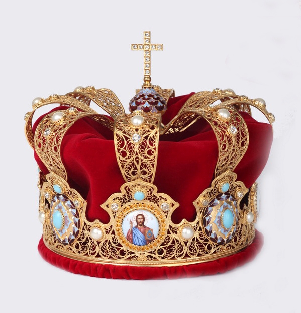 Данные венцы выполнены в традиционной форме короны, а бархатная тулия, тонкая филигрань и цветная финифть придает им особую торжественность и царственность. По обычаю, на венце жениха изображен Христос, а на венце невесты – Божия Матерь.