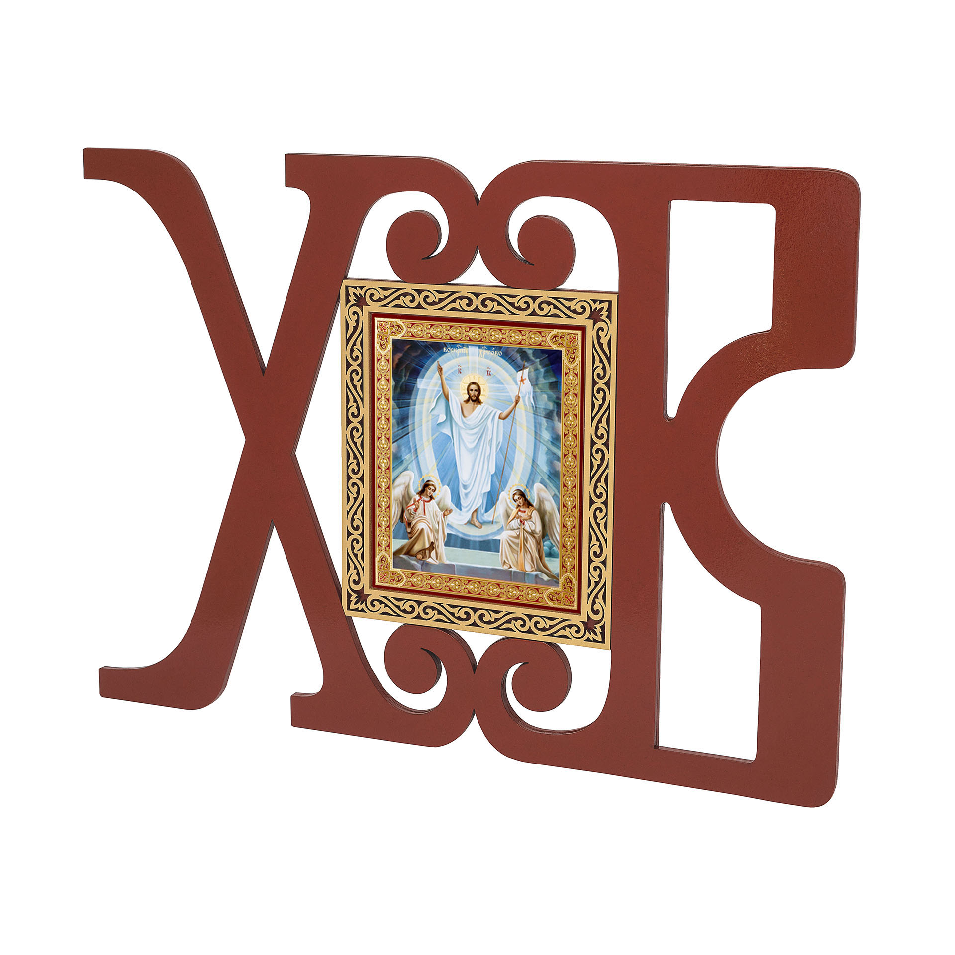 Данная пасхальная вывеска состоит из двух ярко-красных букв «Х» и «В», за которыми скрывается пасхальное приветствие «Христос Воскресе», и иконы Воскресения размером 11х13см. На иконе изображено сошествие Христа во ад: Спаситель держит за руки прародителей Адама и Еву, сзади них стоят ветхозаветные цари и пророки, которые будут выведены из ада. Эта икона иллюстрирует слова пасхального тропаря: «Смертию смерть поправ, и сущим во гробех живот даровав».