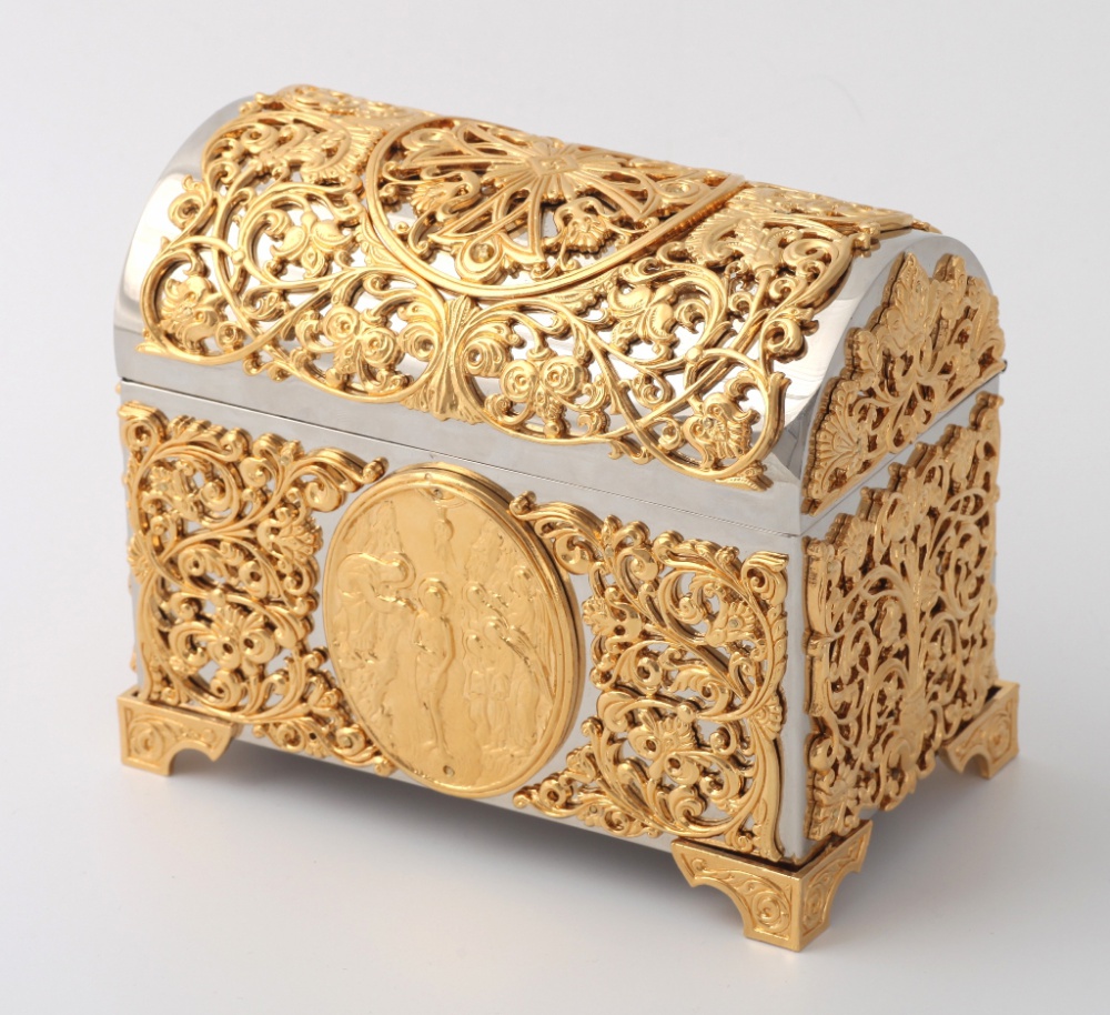 Царственный и торжественный крестильный ящик не только станет удобным местом для хранения всего необходимого для совершения Крещения, но и станет настоящим украшением храма. На нежном серебряном фоне ярко выделяются искусные золотые узоры, сделанные в технике литья. На передней части ящика размещена икона крещения Иисуса Христа в водах реки Иордан пророком Иоанном Крестителем, которая призвана напоминать о происхождении Таинства Крещения.