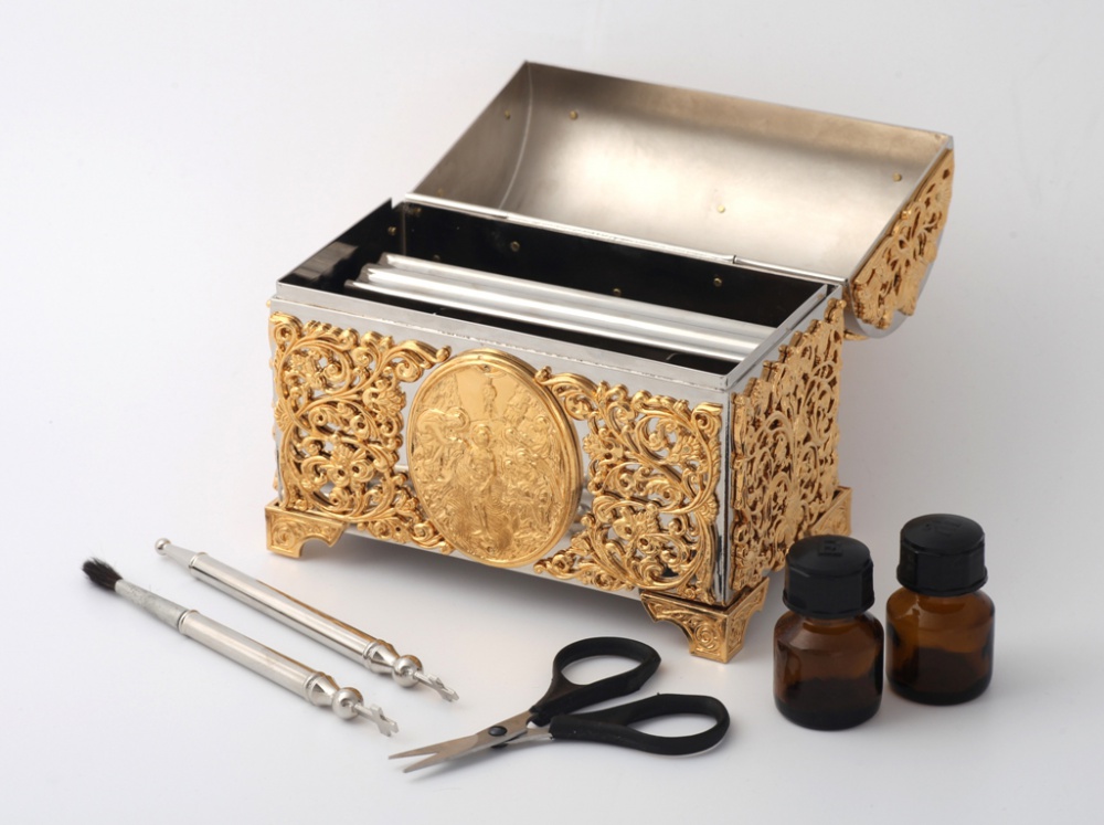 Внутри ящика есть все необходимое для совершения Таинства Крещения: стеклянные сосуды для елея и миро с подписанными крышками, кисточка и стрючица для помазания, а также ножнички для состригания пряди волос. Размер нижнего основания ящика 150 х 85 мм , а вес – 1,6 кг.
