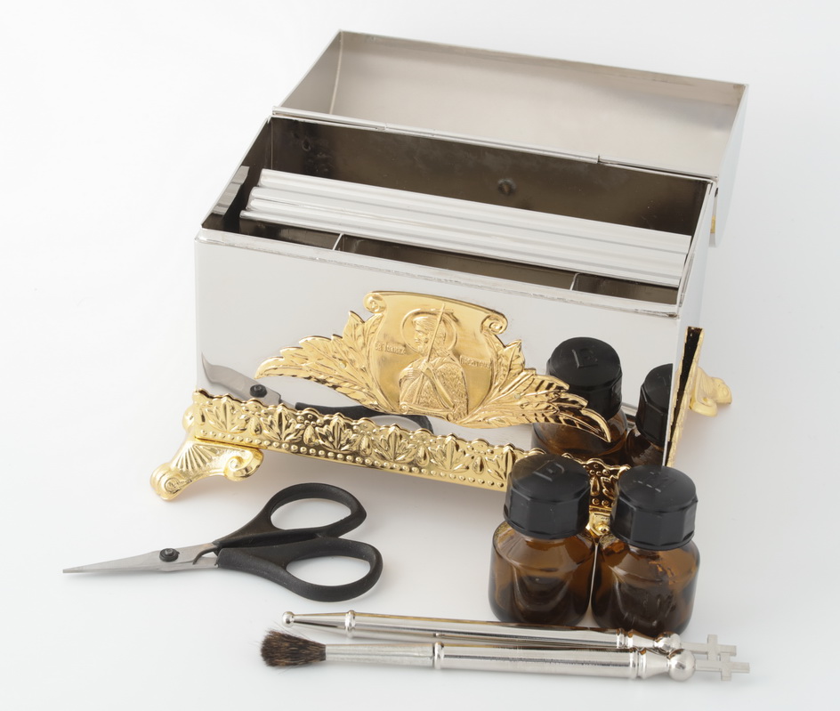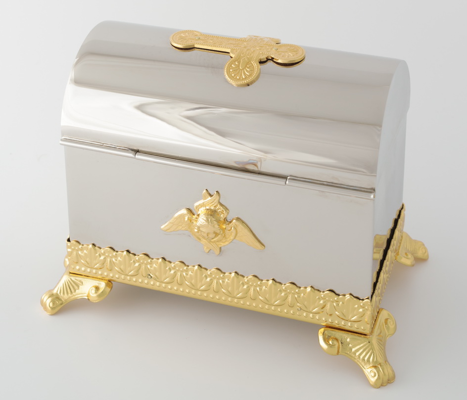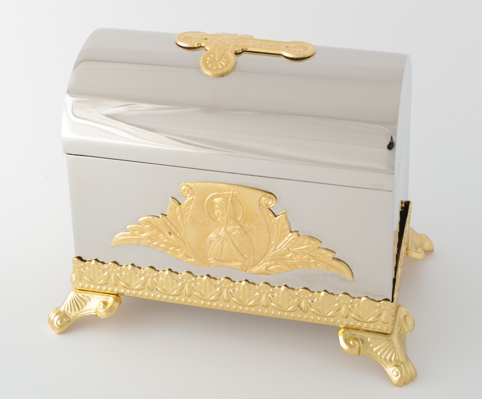 В большом крестильном ящике на ножках, сделанном из латуни и покрытом никелем, есть все необходимое для совершения Таинства Крещения: стеклянные сосуды для елея и миро с подписанными крышками, кисточка и стрючица для помазания, а также ножнички для состригания пряди волос. Нижняя часть ящика обрамлена позолоченным растительным орнаментом, а крышка украшена позолоченным крестом, который ярко выделяется на серебряном фоне. На боковых частях ящика изображены шестикрылый серафим и святой Иоанн Креститель, который крестил в водах реки Иордан самого Иисуса Христа. Большой объем ящика (периметр основания 170 х 105 мм) позволит хранить не только самое необходимое, но и запасные флаконы, свечи, салфетки и другие предметы по усмотрению священника.
