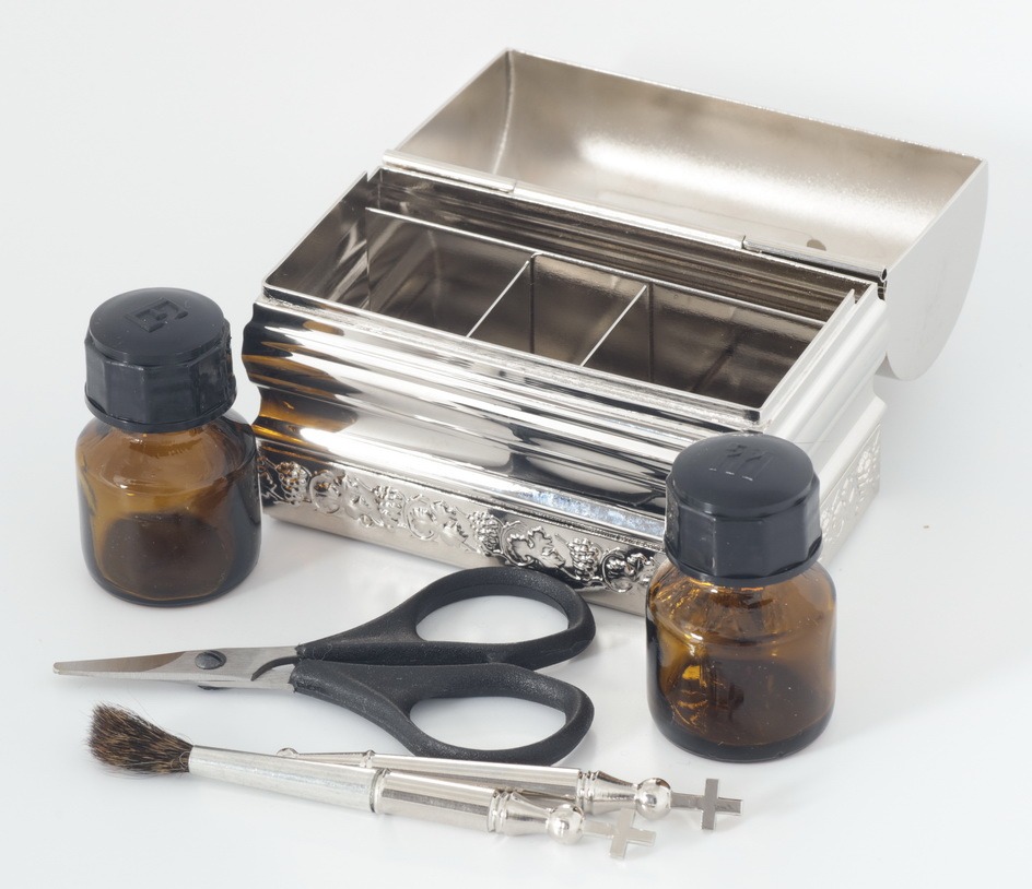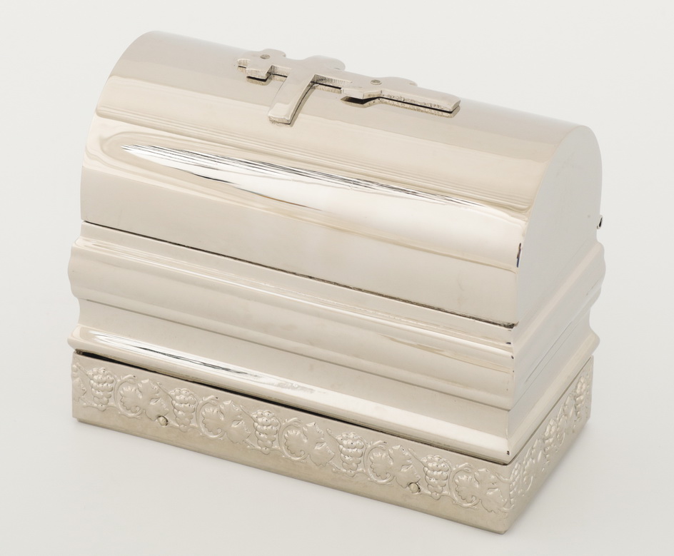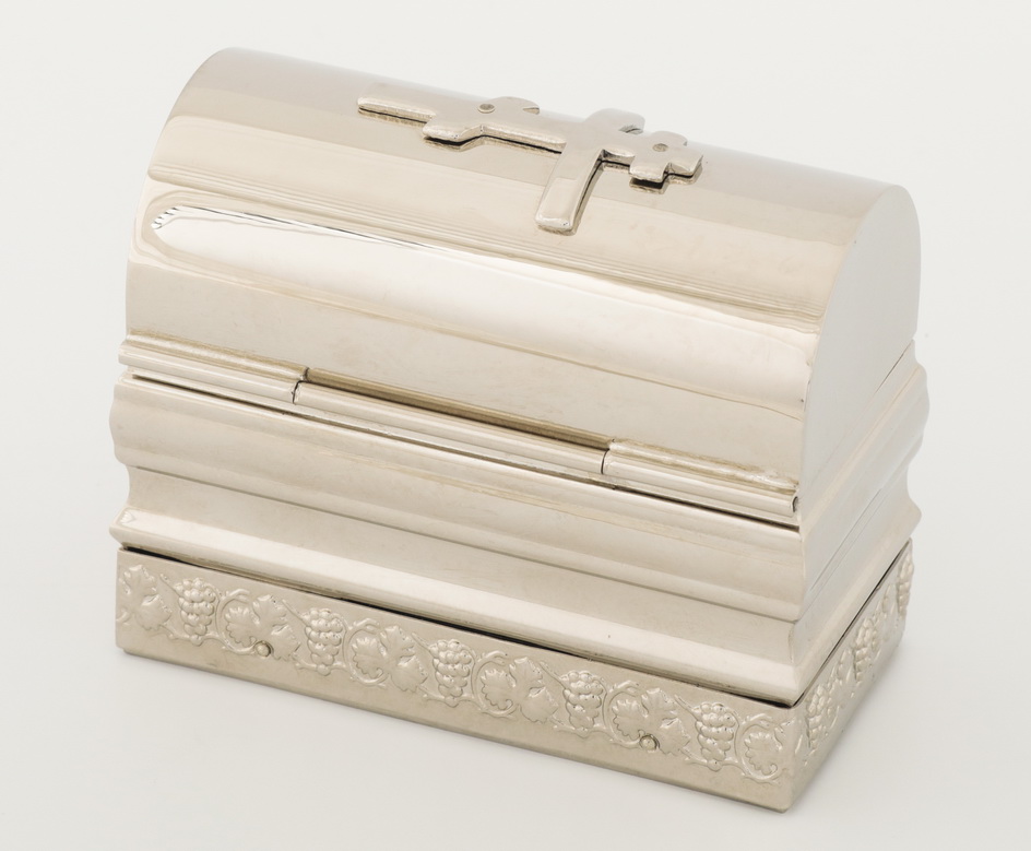 В латуневом крестильном ящике, покрытом никелем, есть все необходимое для совершения Таинства Крещения: стеклянные сосуды для елея и миро, кисточка и стрючица для помазания, а также ножнички для состригания пряди волос. Нижняя часть ящика обрамлена растительным орнаментом, а крышка украшена серебряным крестом. Компактный (периметр основания 95 х 50 мм) и легкий (вес 0,3 кг), этот ящик будет удобен для переноса.
