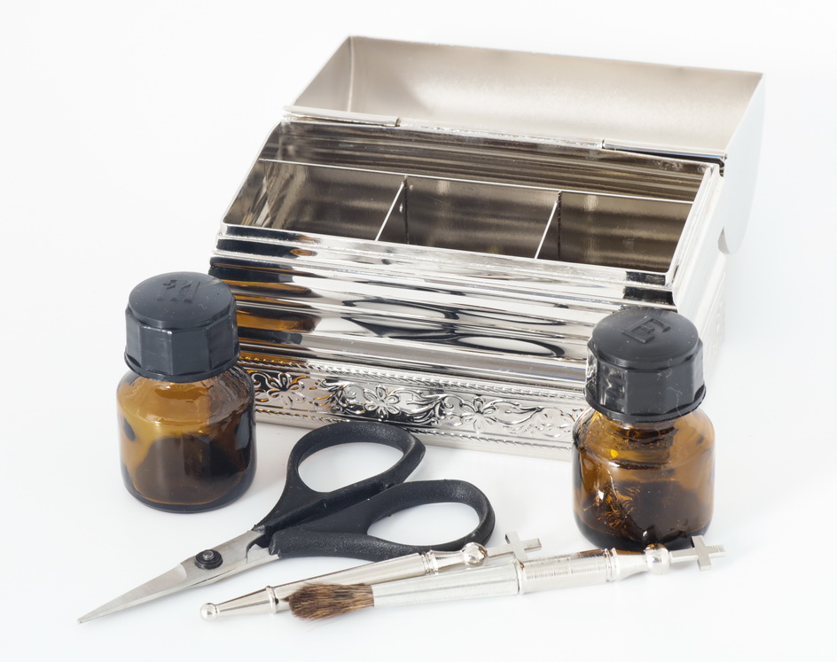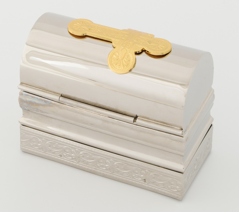 В среднем крестильном ящике есть все необходимое для совершения Таинства Крещения: стеклянные сосуды для елея и миро с подписанными крышками, кисточка и стрючица для помазания, а также ножнички для состригания пряди волос. Нижняя часть ящика обрамлена растительным орнаментом, а крышка украшена позолоченным крестом, который ярко выделяется на серебряном фоне. Компактный (периметр основания 100х55 мм) и легкий (вес 0,4 кг), этот ящик будет удобен для переноса.