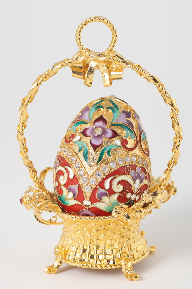 Яйцо пасхальное филигрань, эмаль, камни в корзинке / золочение