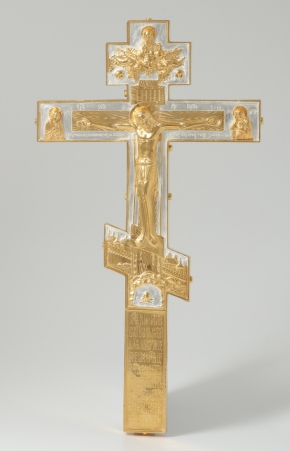 Крест напрестольный №1 рант, литье, филигрань, эмаль, роспись, гравировка / золочение / серебро (УИН)