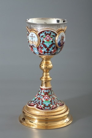 Потир 1.0л 4-деколи, филигрань, эмаль / поддон 1,5л потира / золочение / серебряный стакан (УИН)