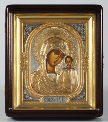 Икона в штампованном окладе 18*24 серебро / киот / золочение / Казанская БМ (УИН)