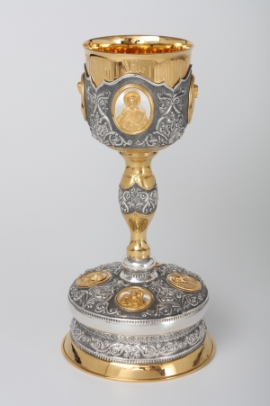 Потир 0.75л 8-литьевых ликов, чеканка / поддон старого образца / золочение / серебро (УИН)