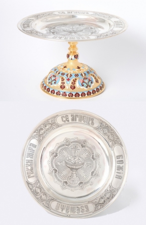 Дискос ручная гравировка / ф220мм / серебро, поддискосник медь / 0,3л "№1" / филигрань, эмаль / золочение / (УИН)