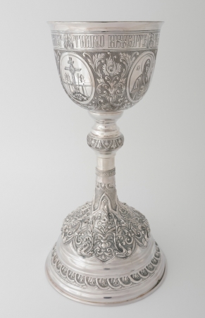 Потир 1.0л ручная гравировка с 4мя-ликами, чеканка / поддон песочные часы / серебро (УИН)